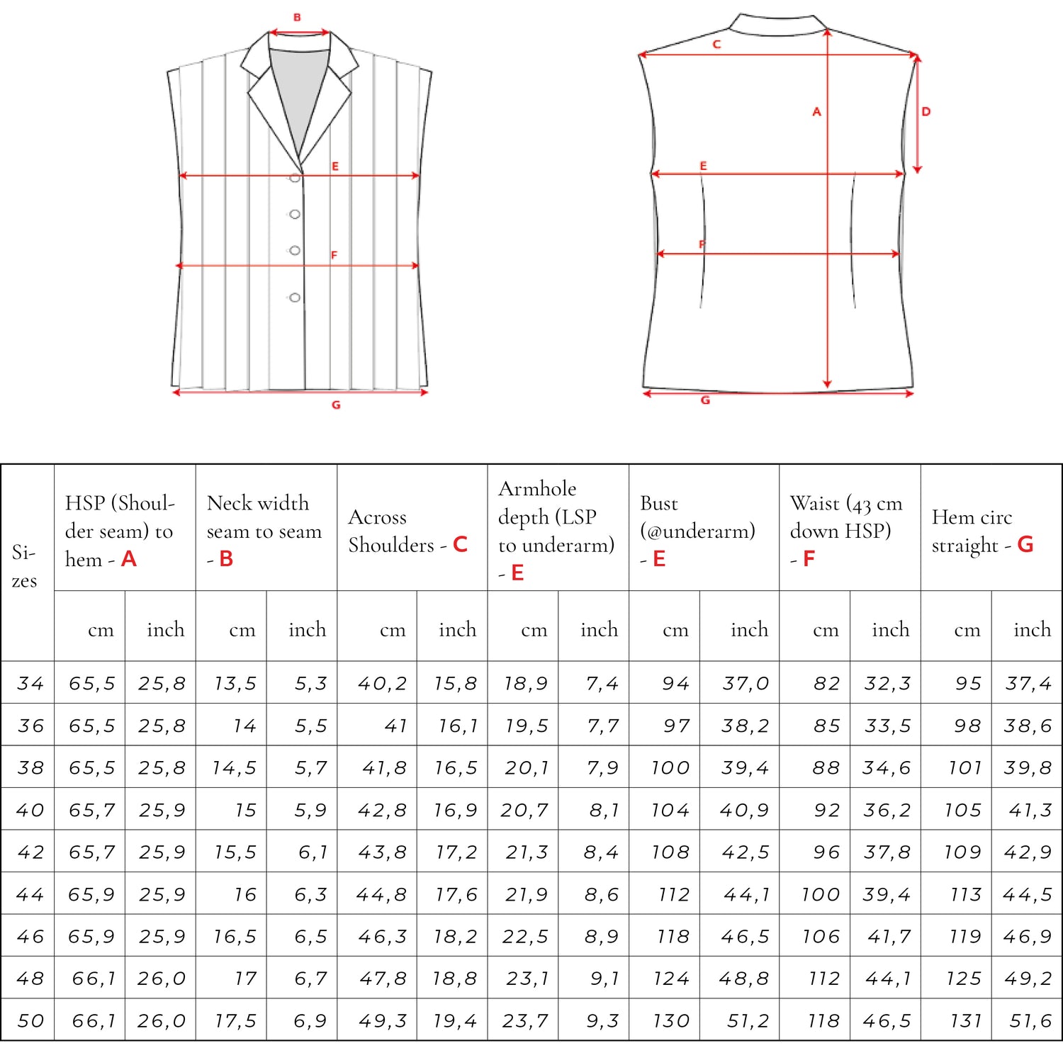 Please find the final measurements of the garment in this table. The measurements can also be found in the instruction booklet.