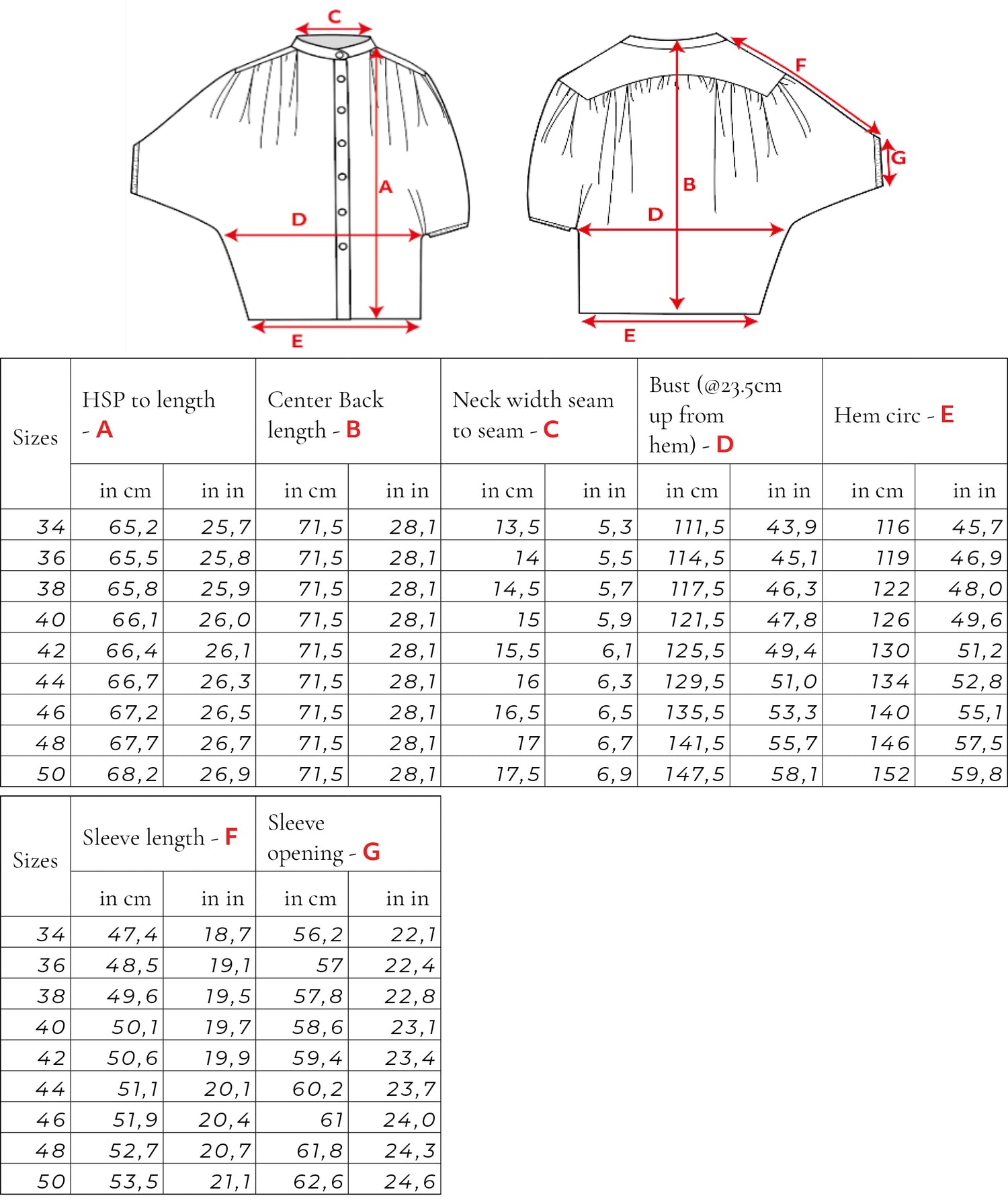 Please find the final measurements of the garment in this table. The measurements can also be found in the instruction booklet.