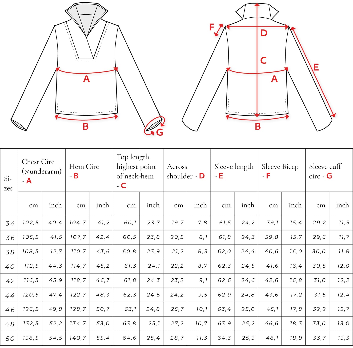 Please find the final measurements of the garment in this table. The measurements can also be found in the instruction booklet.
