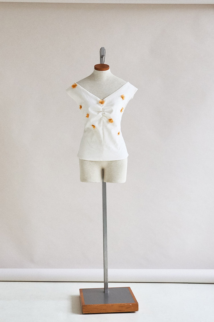 What makes this piece truly special is the possibility to add hand-embroidered floral details along the neckline—ideal for those who want to add a personal and creative touch. Whether paired with a voluminous skirt or styled under a tailored coat for colder seasons, MARGARITE is a versatile top for both everyday elegance and festive occasions.
