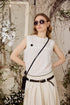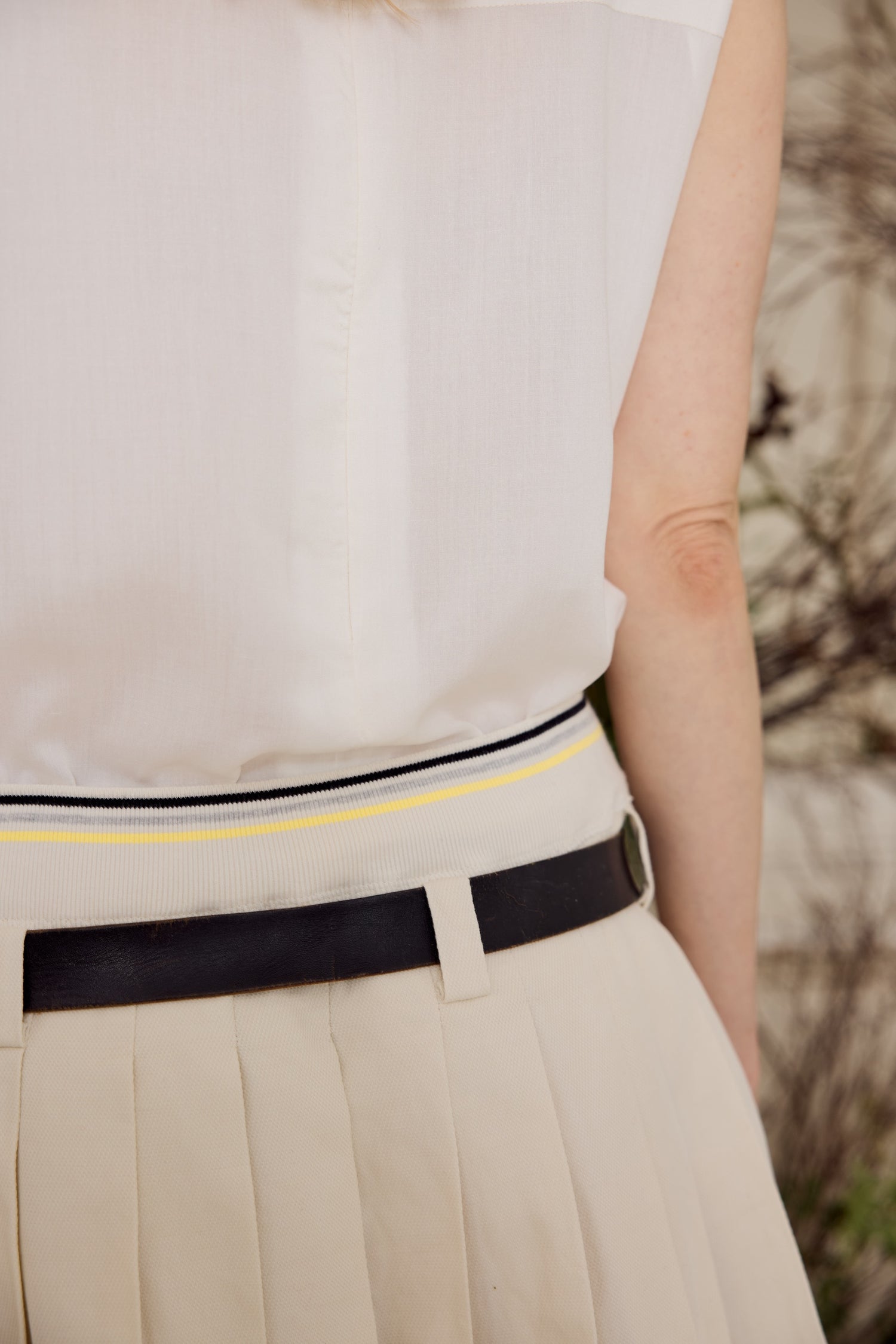 This beautifully structured sleeveless top is defined by its bold horizontal pleats across the bust and back, creating an elegant and textured look. Designed with a classic neckline and a zipper closure at the back, it offers a sleek, modern fit. Armholes and neckline are finished with facing pieces.
