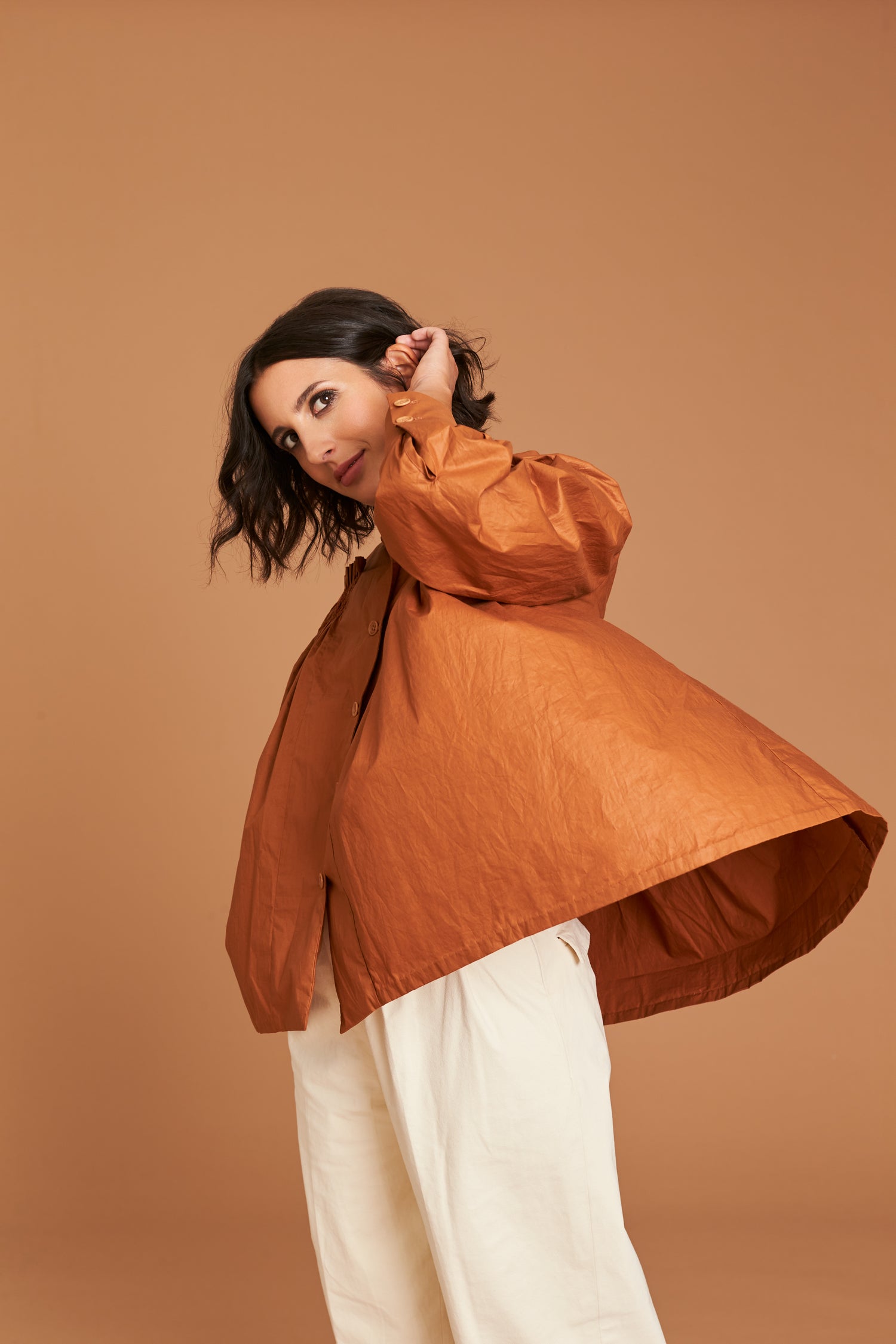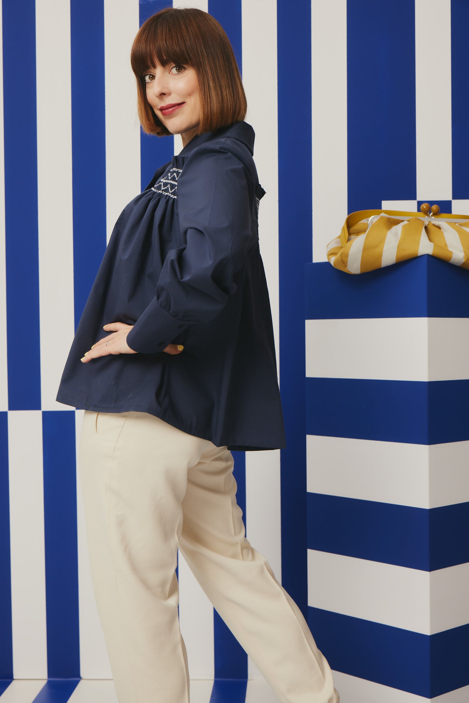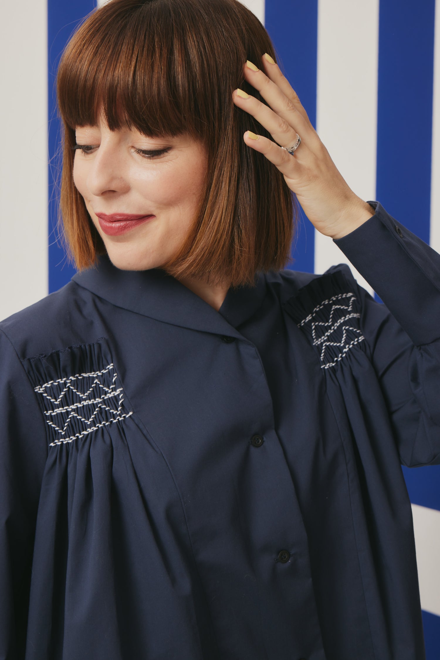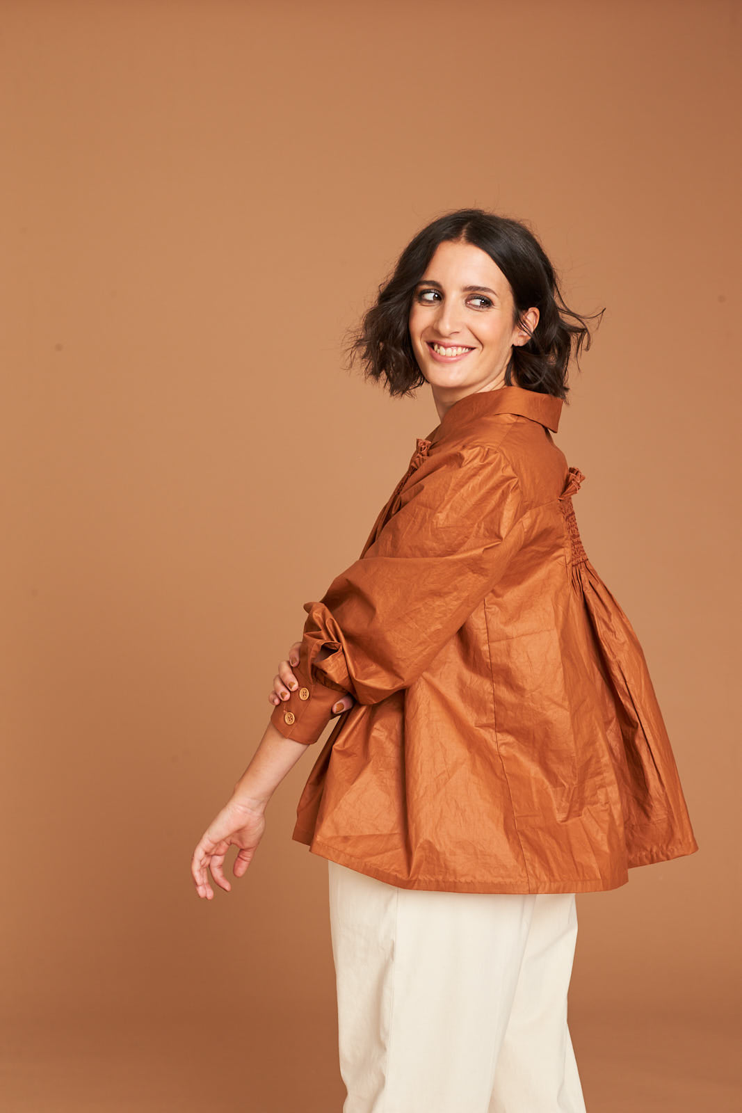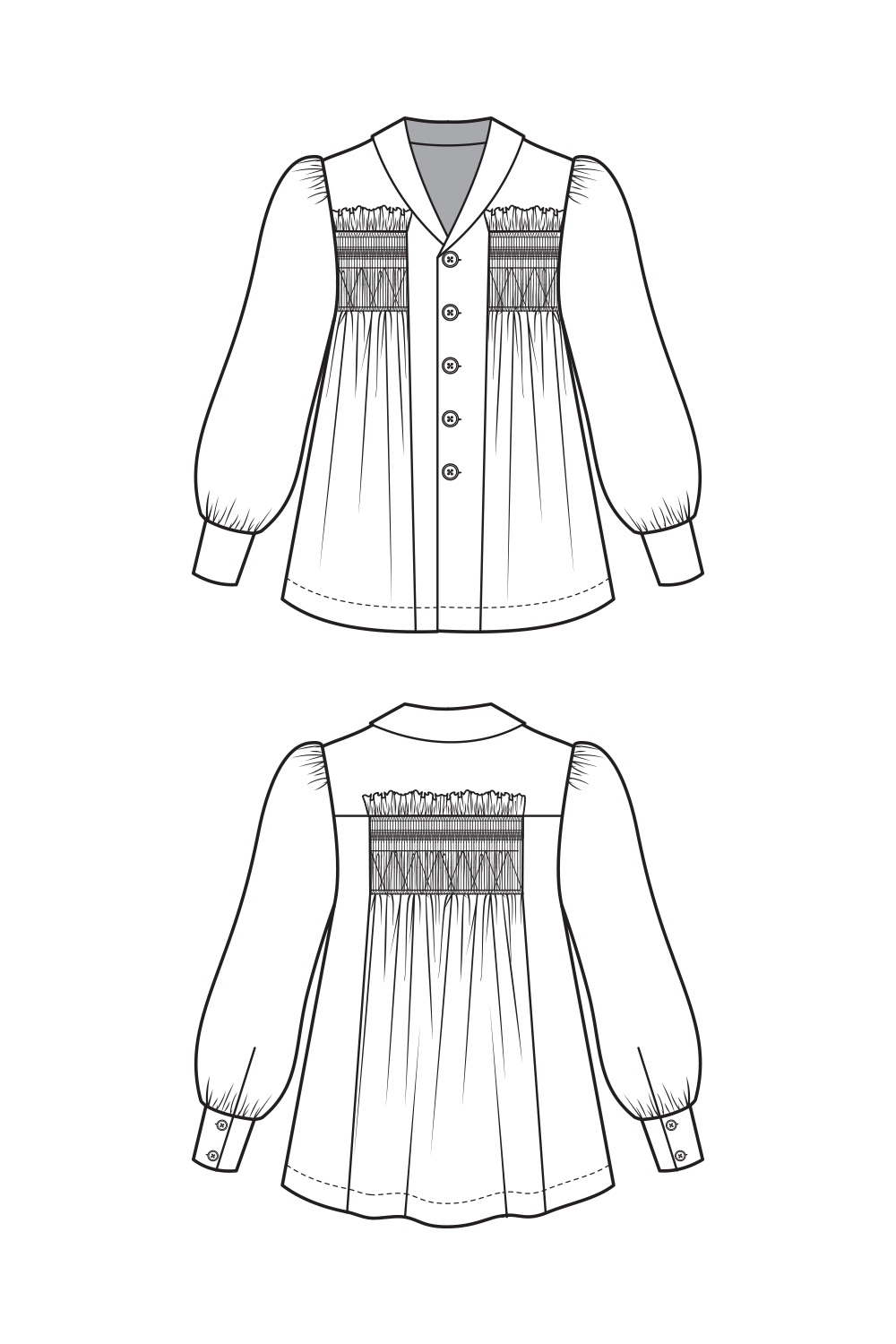 This wide and long-sleeved blouse has a very special cut with many details and is more suitable for advanced sewers. It is ideally made of cotton popline. It has a classic shirt collar, a button panel on the front and two buttons on each sleeve. The cut opens towards the bottom. On the back are folds which are laid and sewn on. A very detailed and special garment with beautiful smocking detail that make this statement piece so very special.