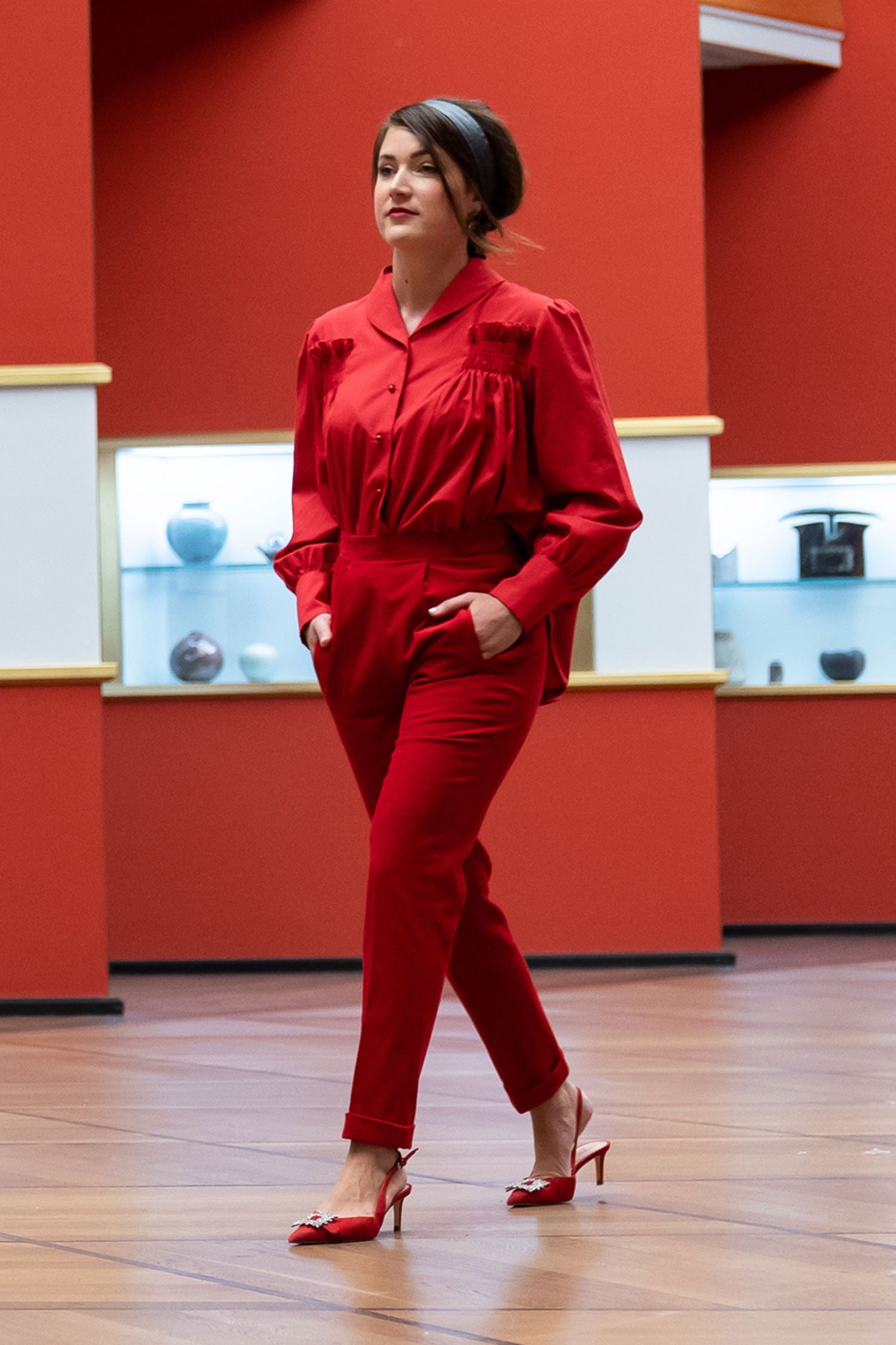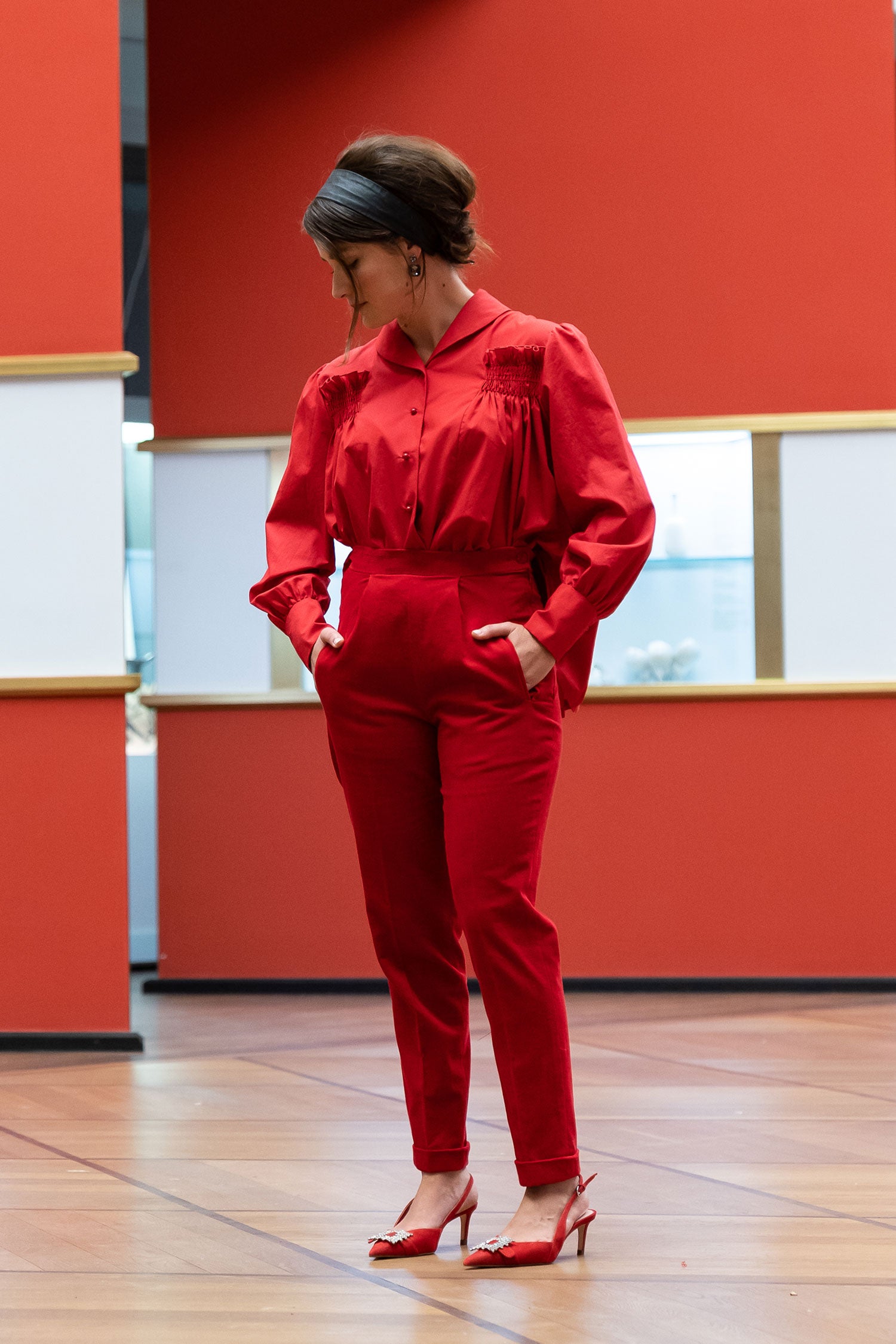 It combines some details that make you feel comfortable and look great at the same time. The crease makes the trousers fine, piped pockets make the trousers high quality, pleats make the trousers comfortable, the waistband makes the trousers feminine and the side seam zipper makes the trousers special. A long time ago, women's trousers were closed almost exclusively on the side. The advantage of not having another three layers on the belly has been forgotten. Especially with thicker fabrics, it just looks better. Sometimes going back to old experiences brings a lot of added value.