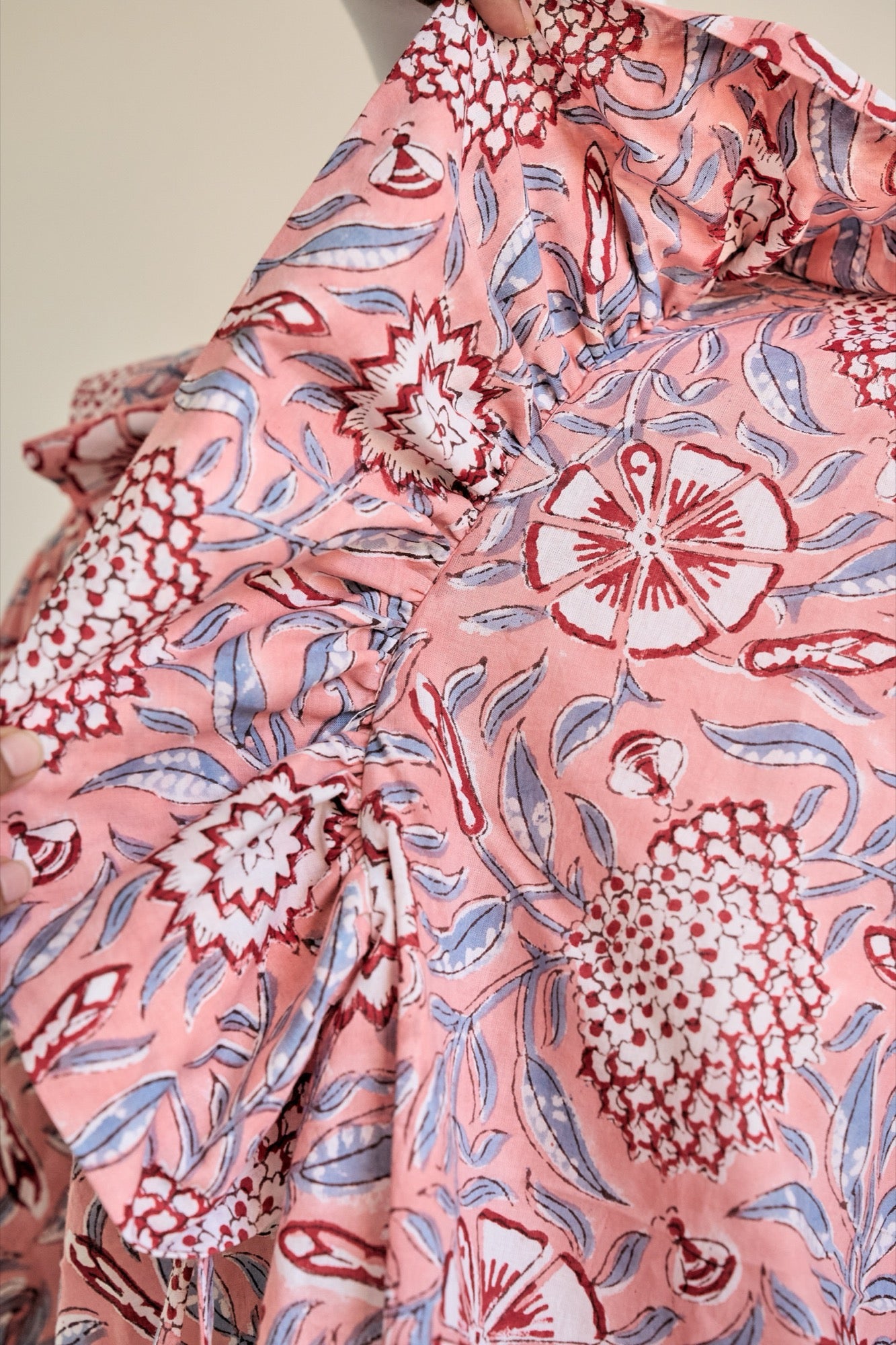 • Neckline ruffle: A gathered ruffle frames the neckline and shoulder seams, finished with a tie closure.