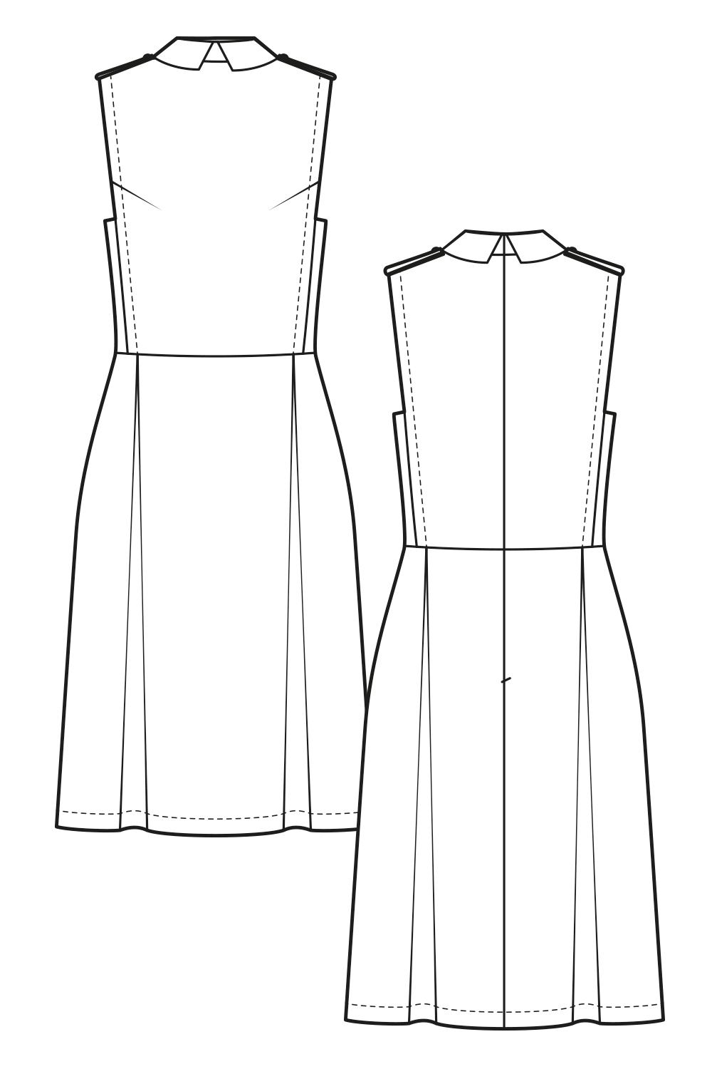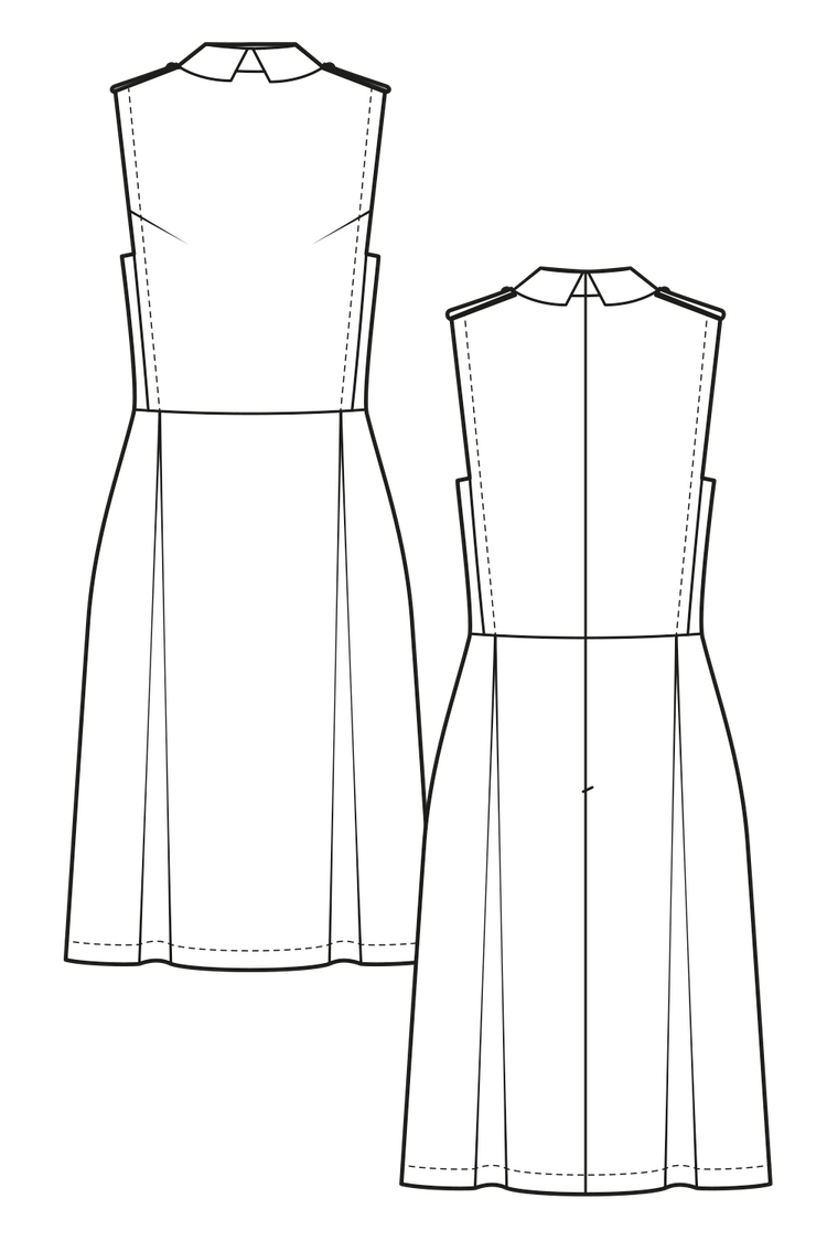This elegant dress has a sleeveless top with collar, darts and leather details. The pleated skirt has a playful swing and fits perfect to the straight line of the top. The long zipper in the back of the dress allows a comfortable dressing. The leather epaulettes give us a modern military vibe. If you like, you could add a belt or wear it without.