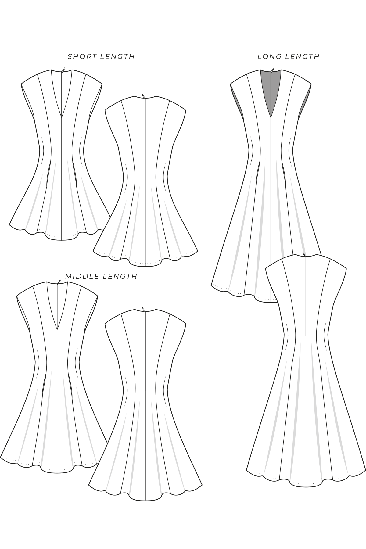 Our eight-panel dress with deep V-neckline is the ideal garment for any occasion. Whether you desire a warm, wintery look or a more lively, playful look for when the temperatures rise, this beautiful dress has you covered – with three different lengths as part of our sewing pattern.