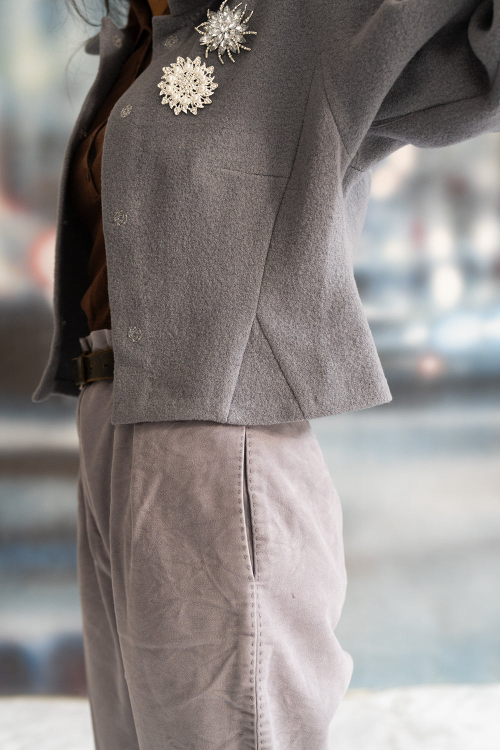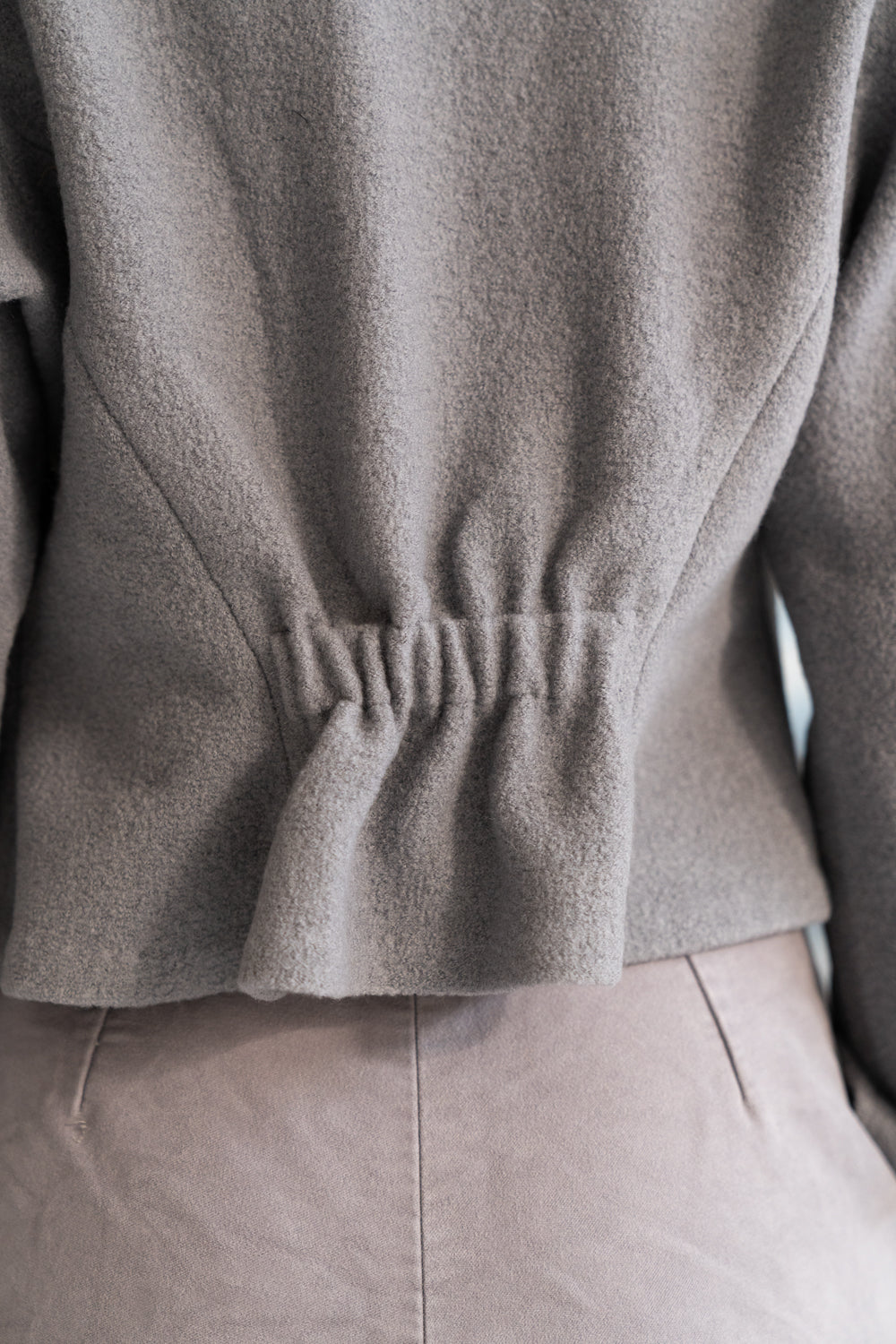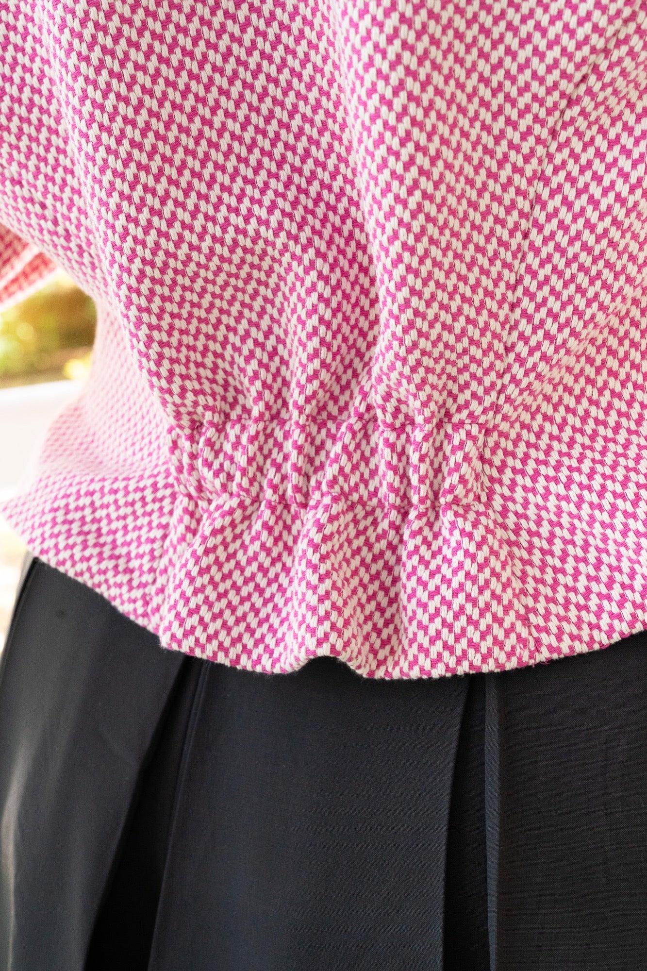 The 67-6 BLISS Jacket combines professional elegance with a fashionable twist. This short jacket features cut sleeves, a peplum silhouette, and a contrasting velvet collar, making it a standout piece. Its unique design incorporates different panels to create a tailored look, while the elastic back adds a round, flattering shape. The cut sleeves enhance the overall round silhouette, and a gusset ensures flexibility, offering freedom of movement. The velvet collar adds an intriguing and luxurious touch, elevating the jacket’s charm and appeal.