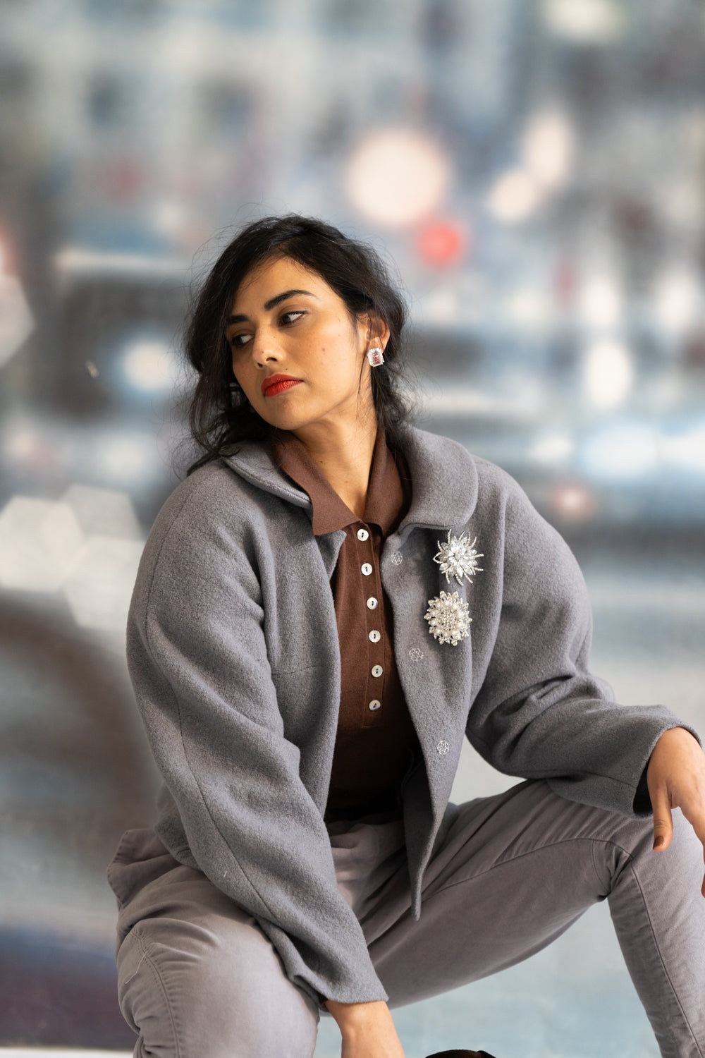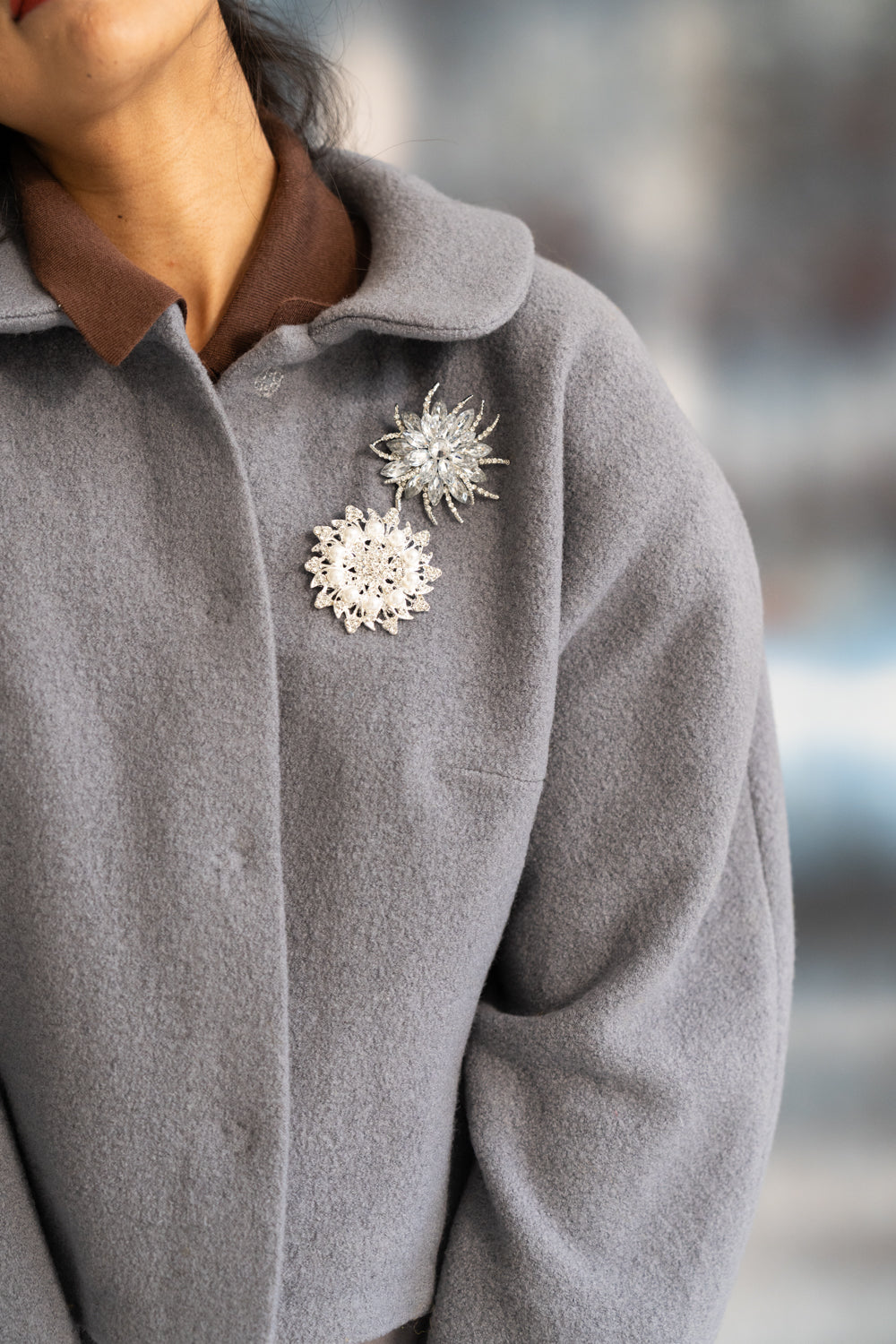 • Velvet Collar: A contrasting, luxurious fabric that adds texture and intrigue to the design.