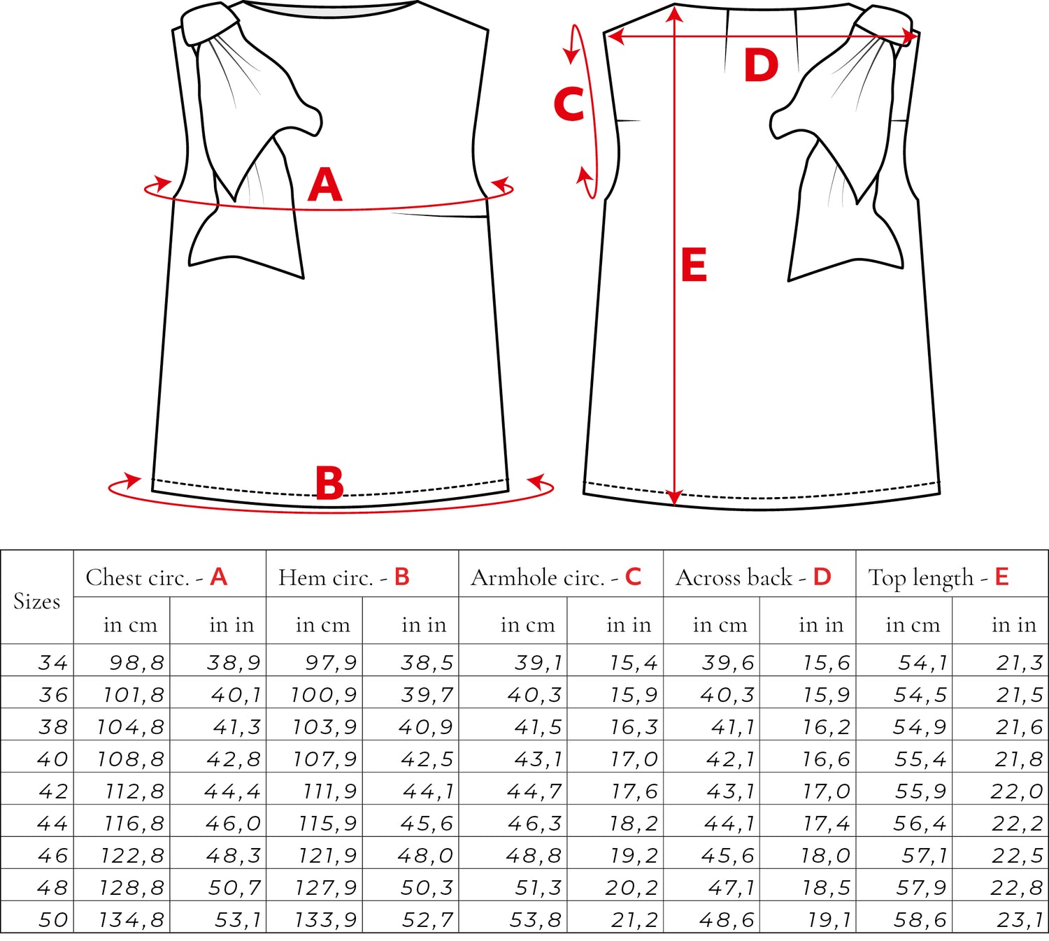 Please find the final measurements of the garment in this table. The measurements can also be found in the instruction booklet.