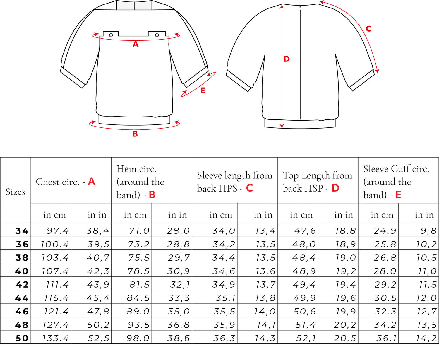 Please find the final measurements of the garment in this table. The measurements can also be found in the instruction booklet.