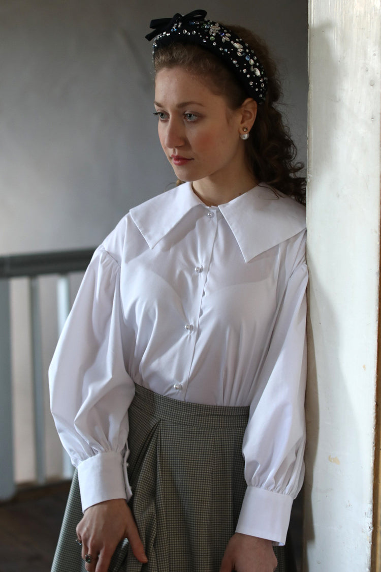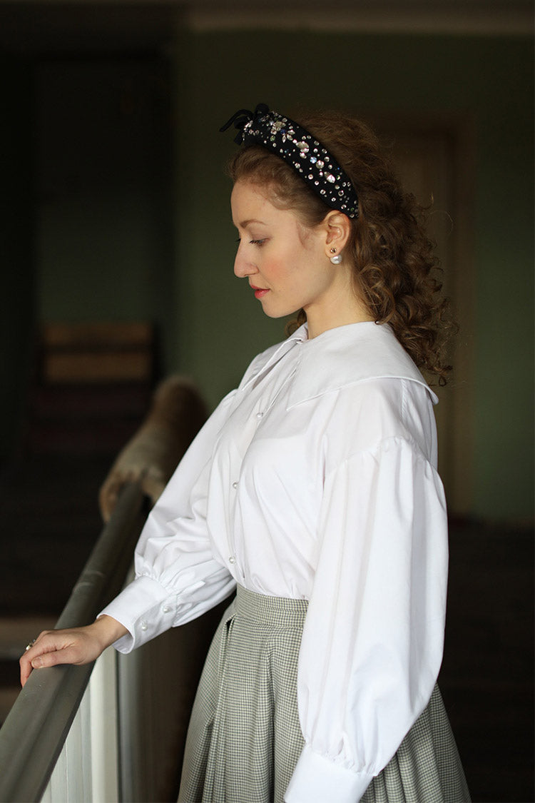 This fancy blouse from the fashion shooting of the sisterMAG issue 48 captivates by its cut and the details. It has a wide cut collar and a button panel on the front, which is visually enhanced by high-quality pearl buttons. The sleeves cover the whole arm length and are cut like balloons. The model is suitable for everyday use as well as for more chic occasions.