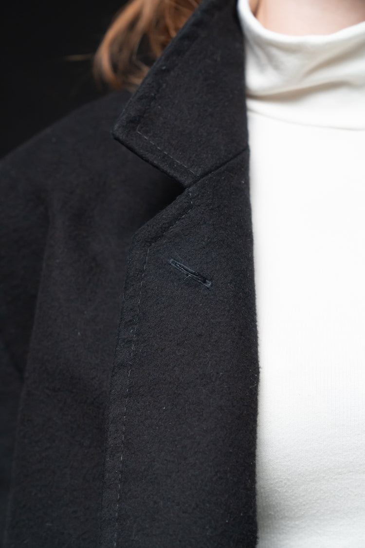 Featuring one set of double-breasted buttons, this jacket offers versatility in styling and adds a touch of classic charm. We tailored it from Moleskin, a robust single-colored cotton fabric known for its durability and warmth.