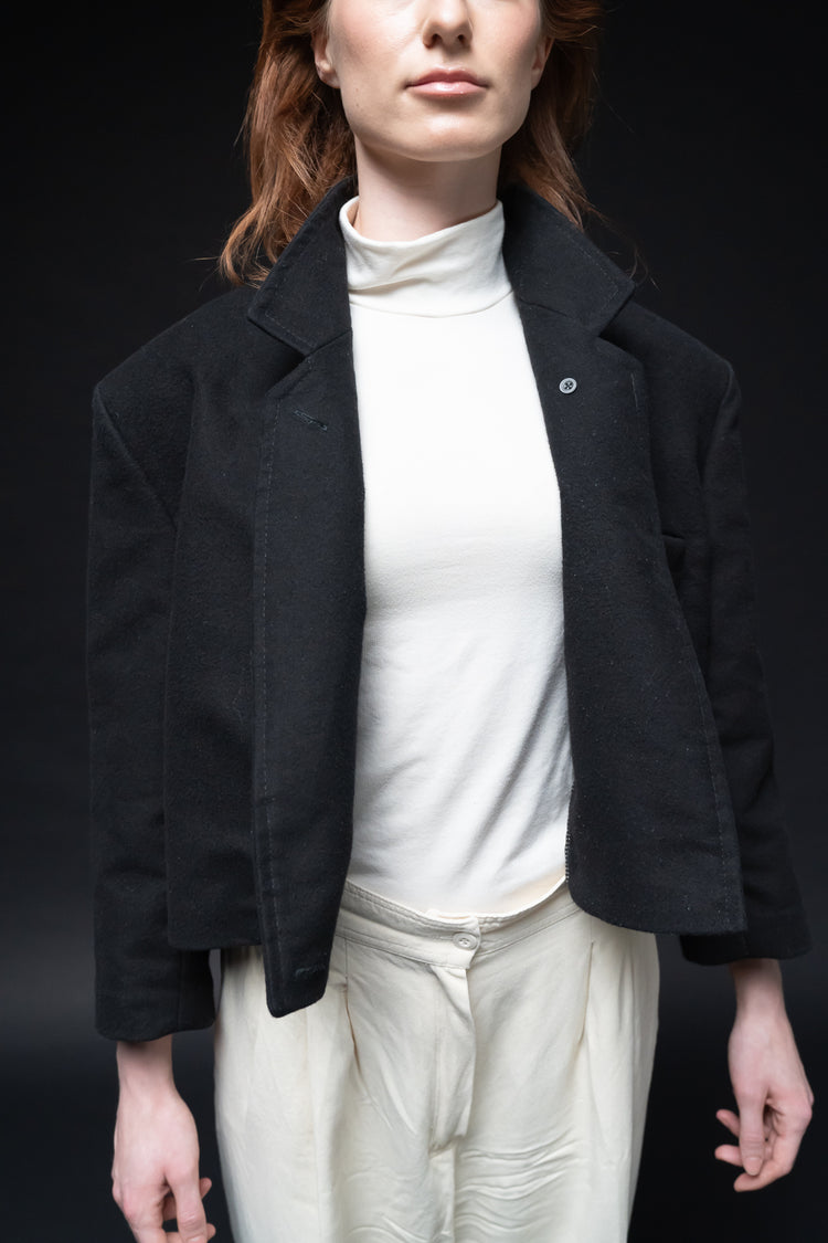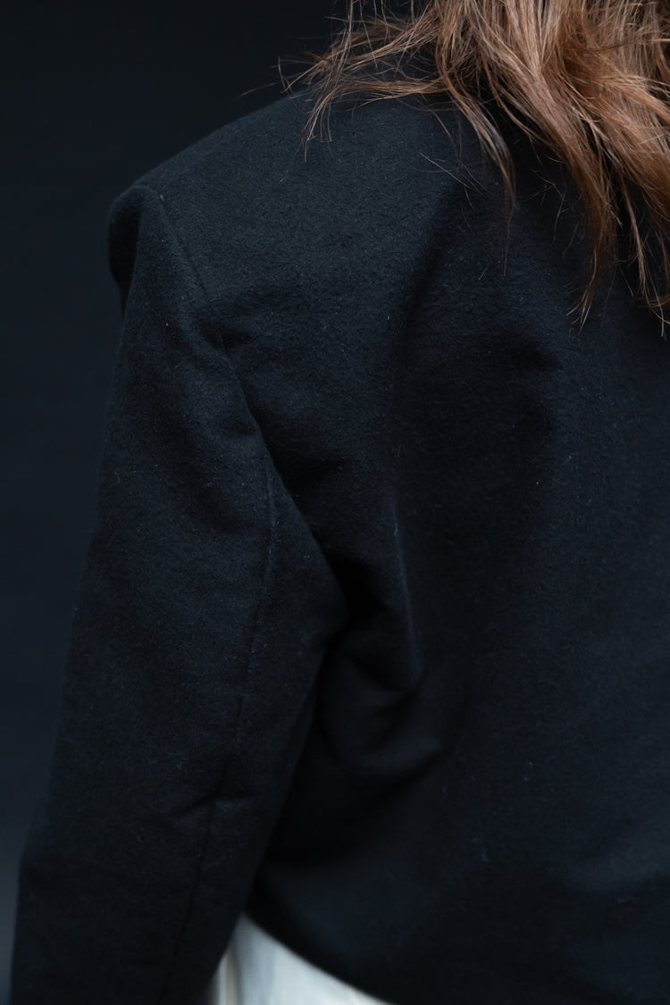Distinguished by its unique lapel collar and exquisite bias tape detailing along all seams, this jacket is a testament to fine craftsmanship and attention to detail. The lapel collar adds a touch of timeless elegance, while the bias tape ensures clean lines and durability.