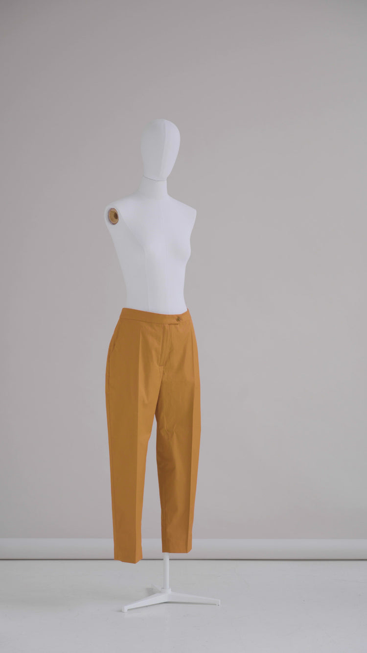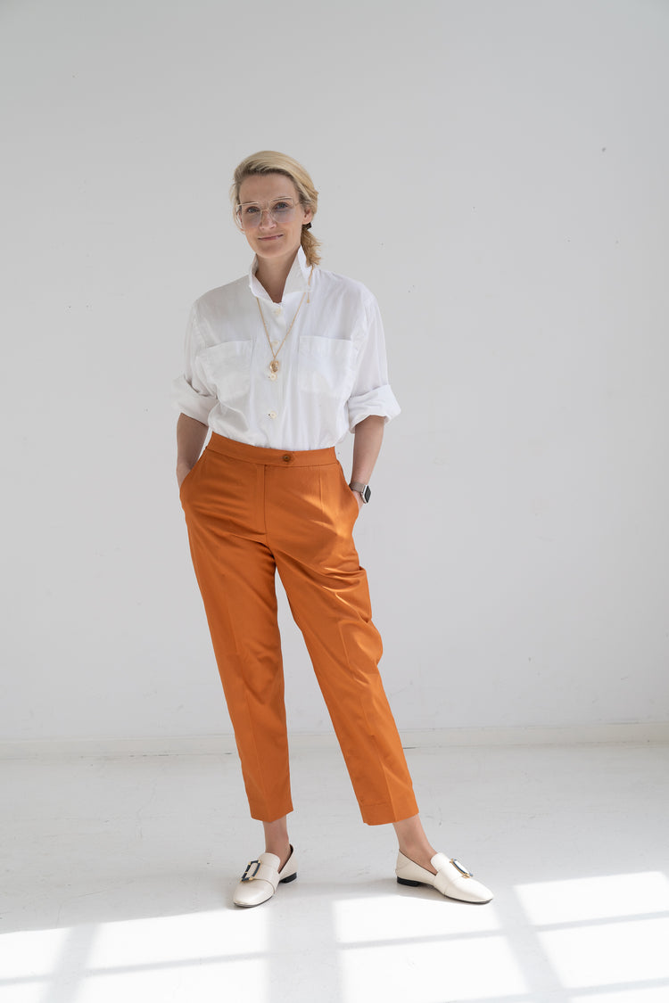 Strike the perfect balance between comfort and style with these tailored trousers, which come with two pockets. The subtle grace of pleats perfectly complements a silhouette that is neither too loose nor too tight. The versatility of these pants is truly a marvel: they can effortlessly adapt to any fabric or color, creating an endless array of possibilities for personal expression. And it is a perfect sewing pattern for beginners, who haven't mastered too many pants so far.