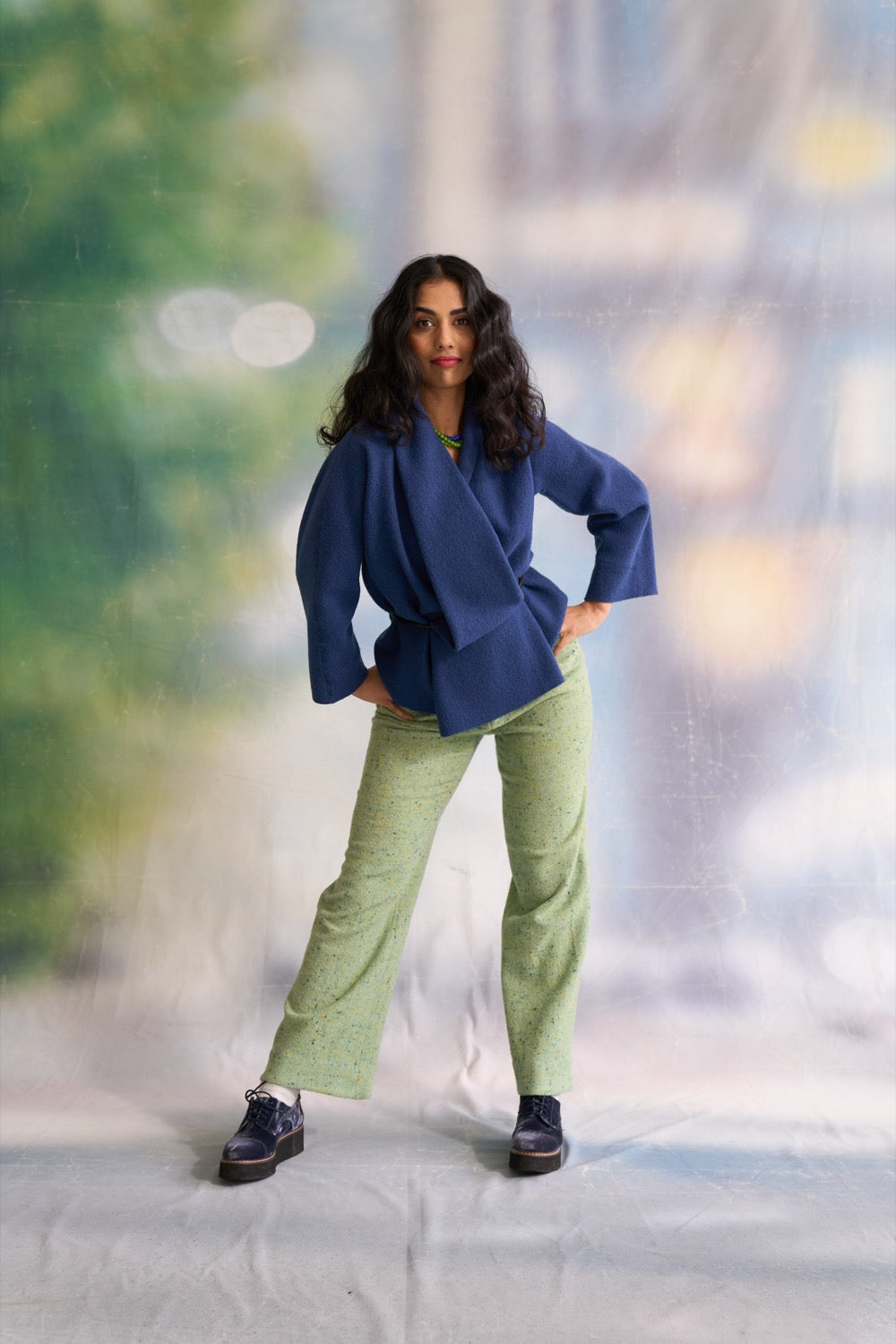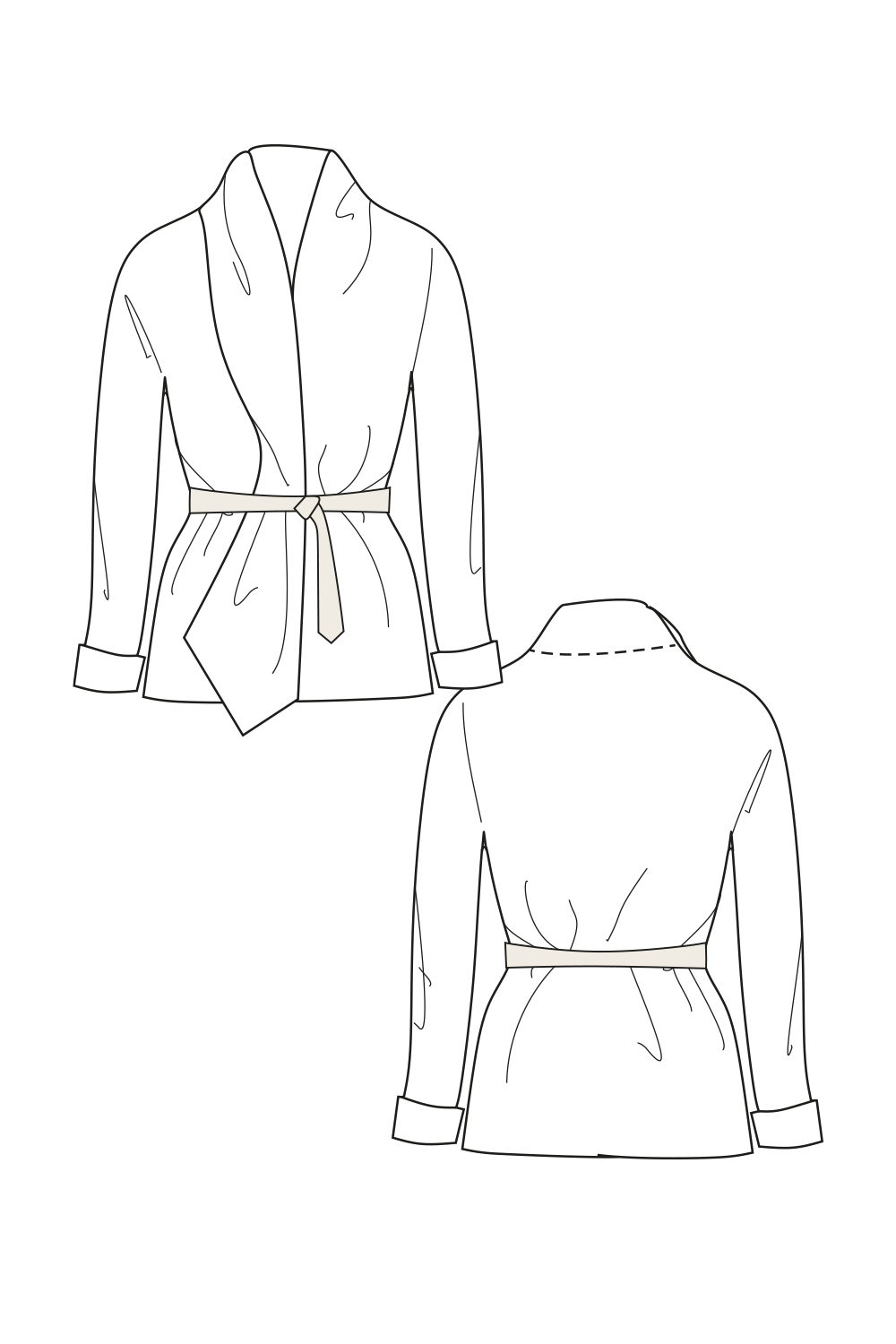 Create your own statement piece with the 32-5 Wrap Jacket sewing pattern, designed to be made from luxurious boiled merino wool. This jacket features a unique shawl collar with a striking triangular shape, adding a bold 3D effect to the front. Its versatile 3/4 length sleeves can be rolled up for a more relaxed look, making it perfect for both casual and formal wear. When paired with a belt, this jacket offers a chic, effortless style ideal for the colder months.
