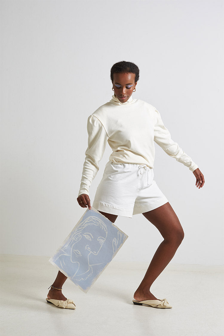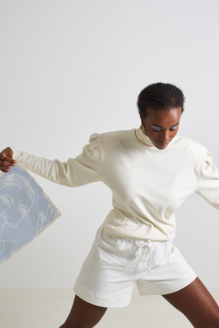 This shirt with leg-of-mutton sleeves from the fashion shoot of sisterMAG issue 60 is made of a stretchy fabric, like cotton jersey with a thicker quality. The unusual leg-of-mutton sleeves visually enhance the simple shirt. So it is not only extremely comfortable and cosy, but also beautiful to look at!