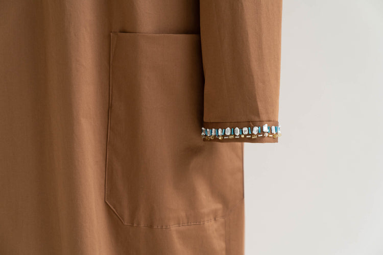 Make a lasting impression with the 62-5 GLEAM Straight Dress, designed to blend elegance and practicality. This dress features a stunning beaded neckline that adds a touch of glamour, while the straight silhouette offers a flattering and classic fit. With long sleeves and sleeve cuffs, it's perfect for cooler months, and the welt bust pocket gives it a polished, functional appeal. An additional pocket ensures you can keep your handkerchief or small essentials close by.