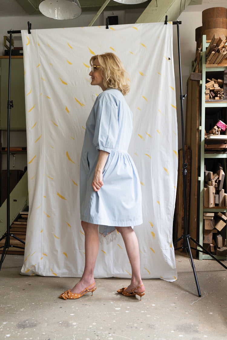 This dress comes with an intriguing low back and a back yoke. The front is buttoned down with a classic shirt dress as inspiration. The collar therefore comes with a collar stand. In the front you can add two flap pockets. Notably, the sleeves are gathered at the bottom, giving a stylish balloon-like shape, adding an extra layer of trendy appeal.