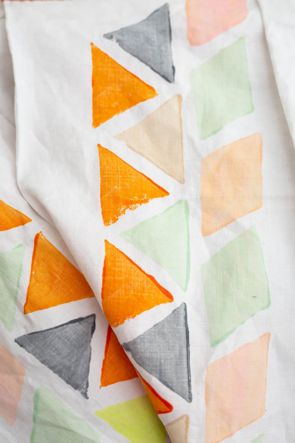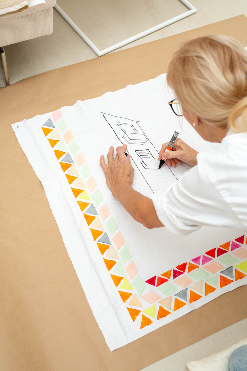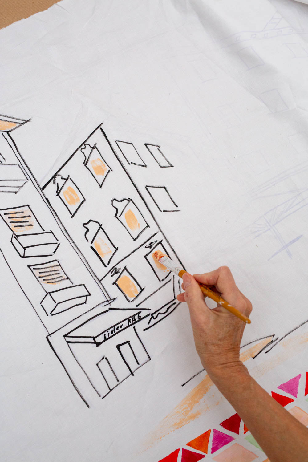 • City illustration & border print: Transfer the city motif with a textile marker and stamp the border using hand-carved potato stamps for a colorful, artistic edge.