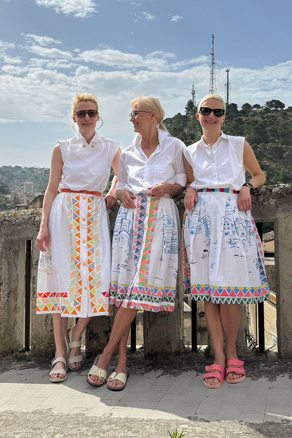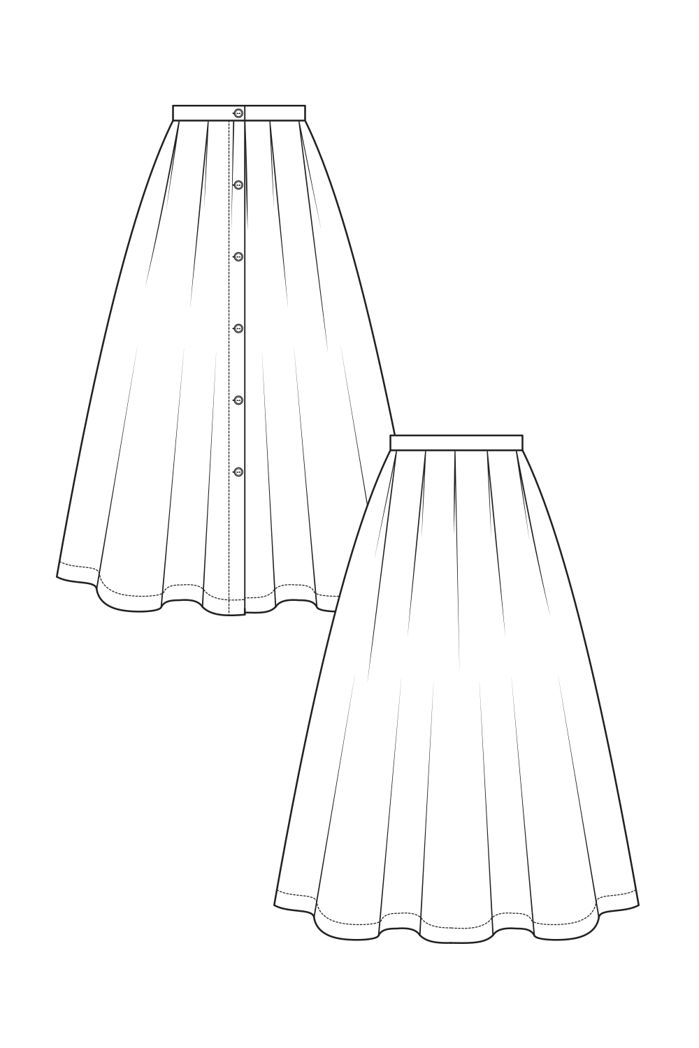This A-line skirt is not just a sewing project – it’s an art project. With its classic silhouette and clever front pleats, it gains a one-of-a-kind look through a hand-stamped border and illustrated cityscape, created using potatoes, textile paint, and fabric markers. The design allows for personalization, creativity, and a touch of nostalgic flair, while still being elegant and wearable.