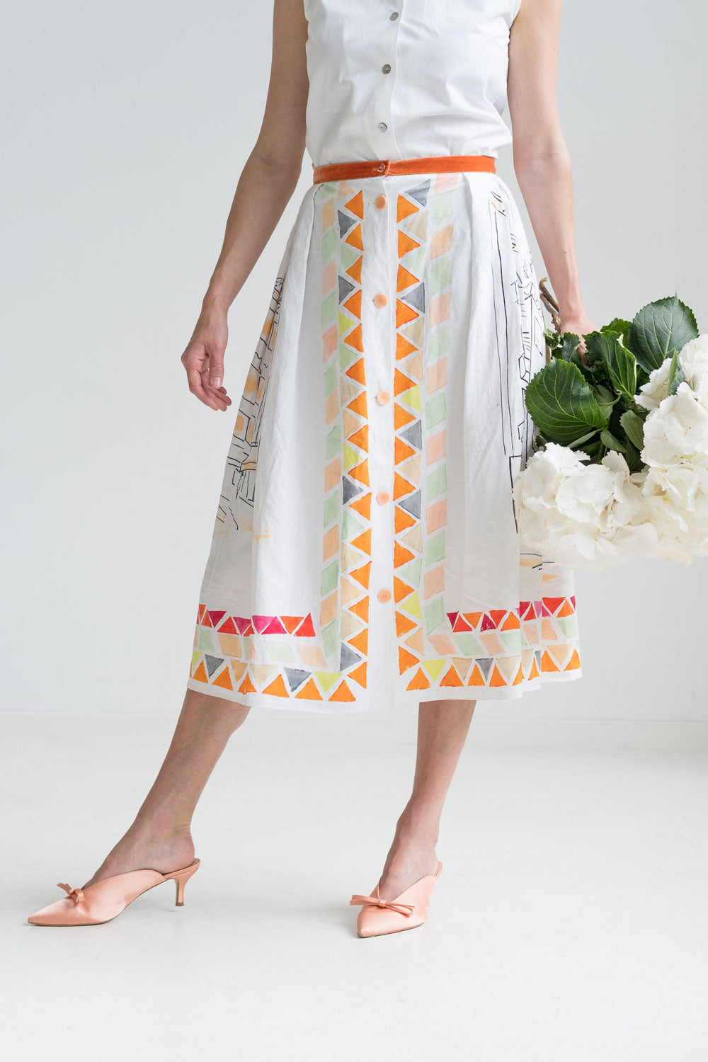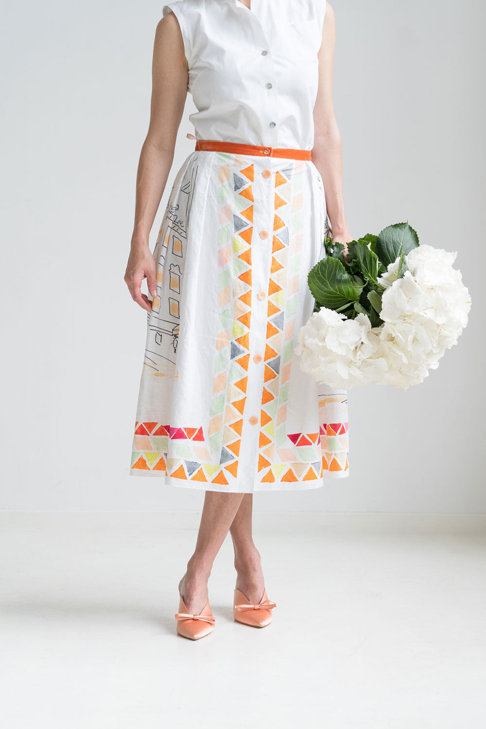 45-5 PIAZZA STORICO Buttoned-down skirt with potato-stamped cityscape