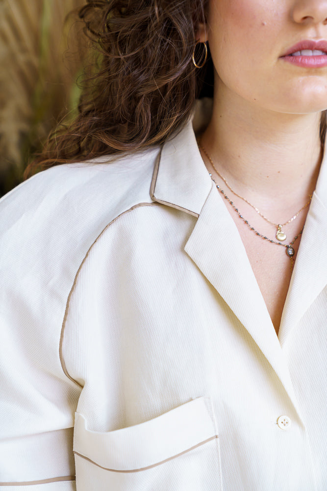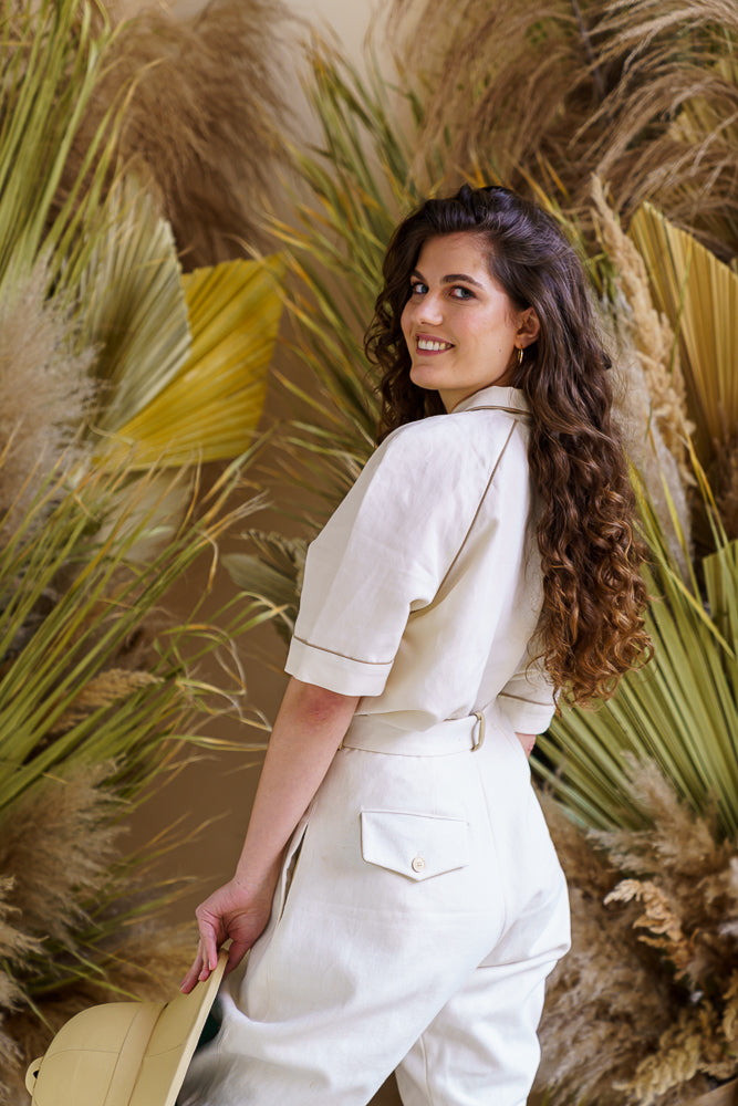 With its relaxed silhouette and refined finish, our SABLA blouse is the perfect choice for everyday elegance. Featuring raglan sleeves with a historical touch and sophisticated piping details, it elevates a casual look while staying timeless. The lapel collar adds just the right amount of structure for a clean, tailored impression. Pair it with the matching trousers or wear it tucked into high-waisted skirts—this pattern is as versatile as it is stylish.