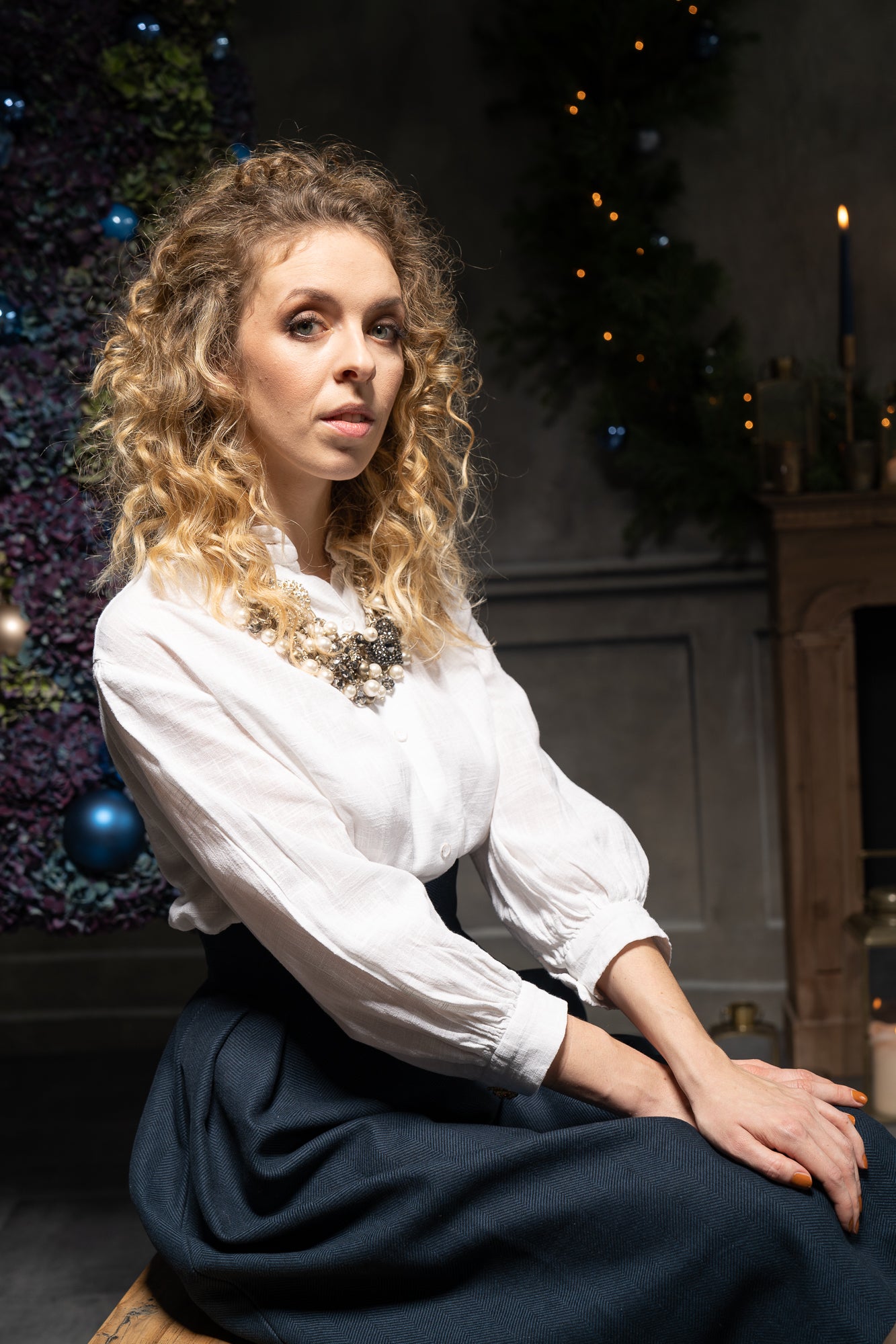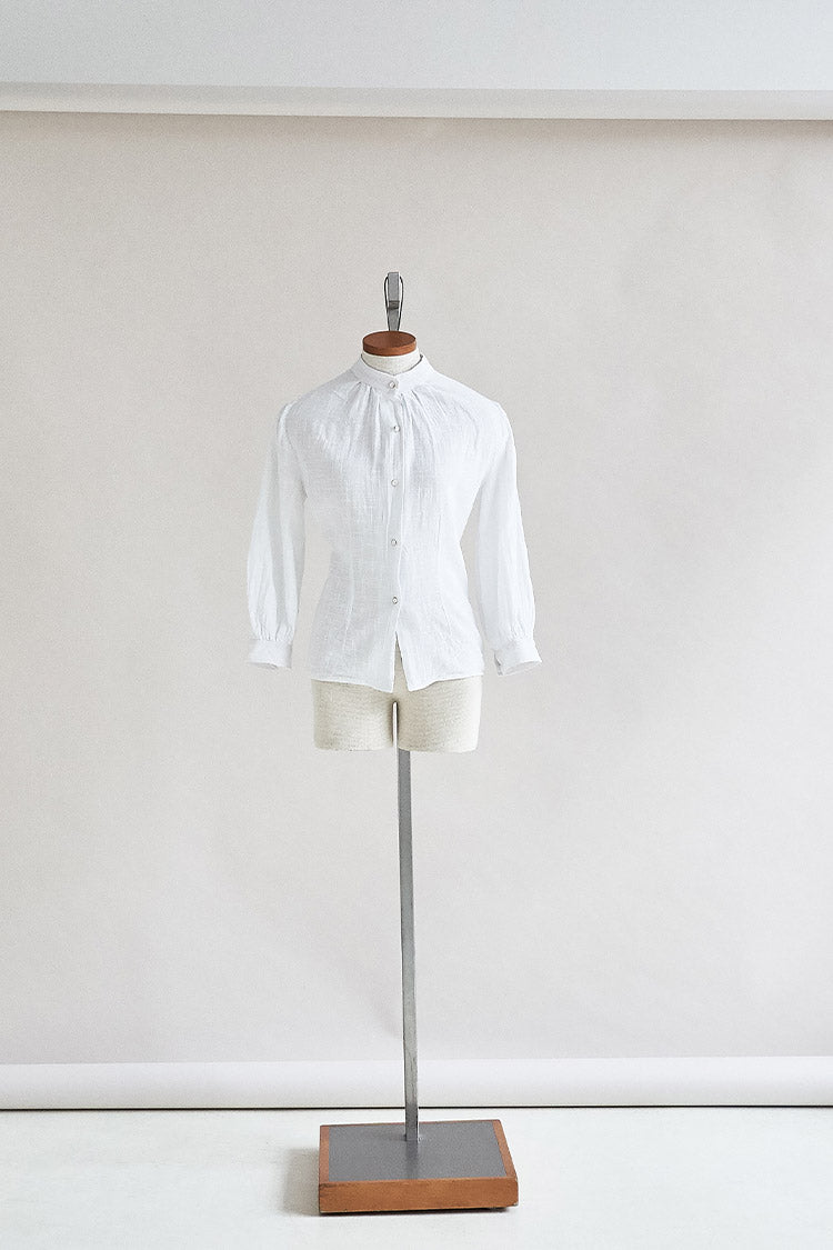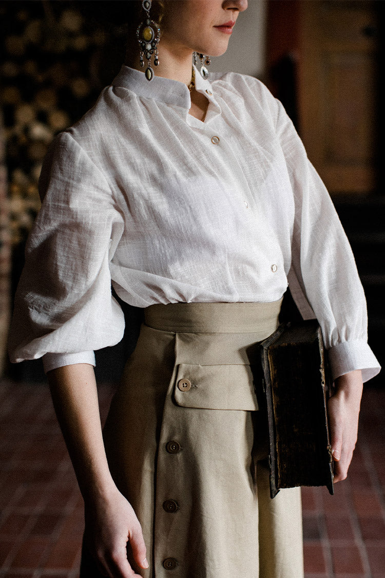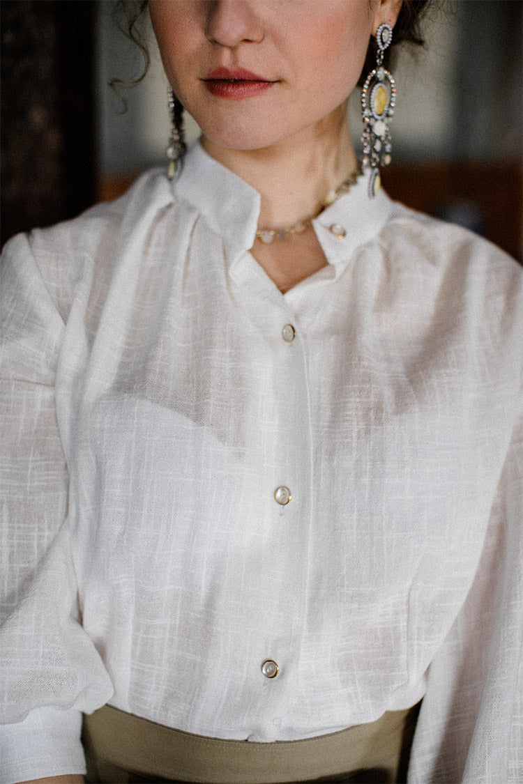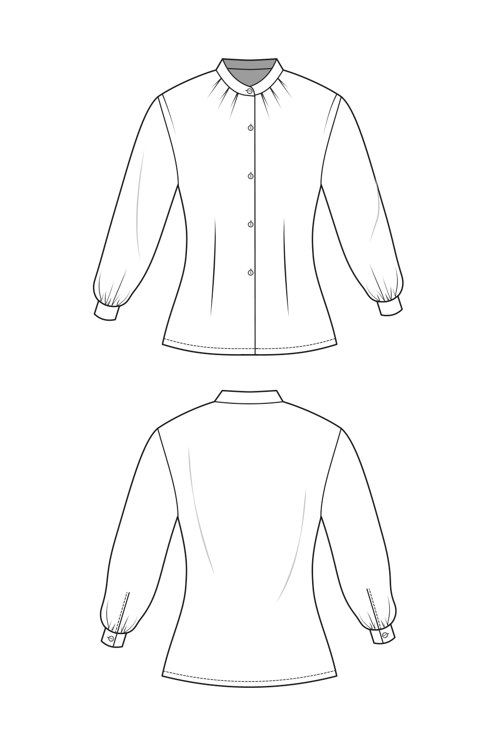 The CALICO Blouse is an airy, softly flowing design that plays with lightness and delicate structure. Originally created for the fashion shoot of sisterMAG issue 48, this blouse is perfect to shine even in more sheer or semi-transparent fabrics or brushed cotton, allowing the construction details to remain subtly visible. A small stand collar, gentle pleats at the neckline, and softly shaped sleeves create an elegant silhouette that feels effortless yet refined. CALICO transitions seamlessly from everyday styling to more dressed-up occasions, depending on how it is combined.