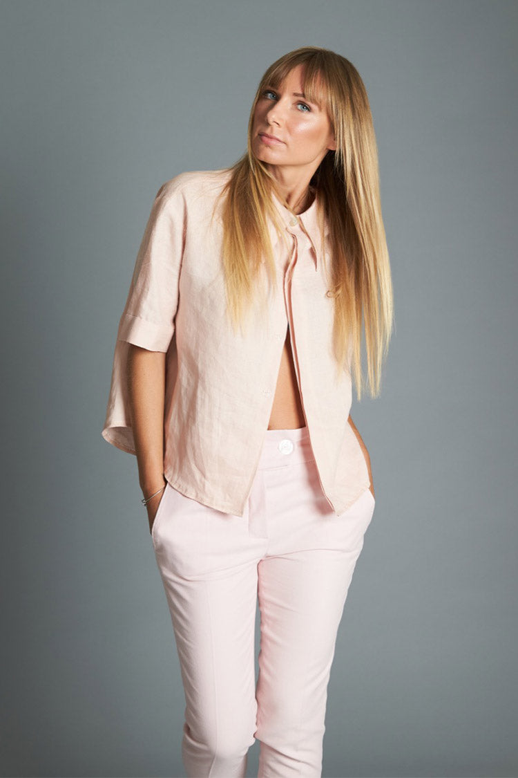 A special highlight of our sisterMAG issue 52 is the Bauhaus-inspired fashion feature and the matching box-cut linen blouse in soft pink. It is ideally made of a light material such as linen, has a pointy collar and thick buttons on the sleeves. Combined with trousers or a skirt, it is ideal for a harmonious everyday look.