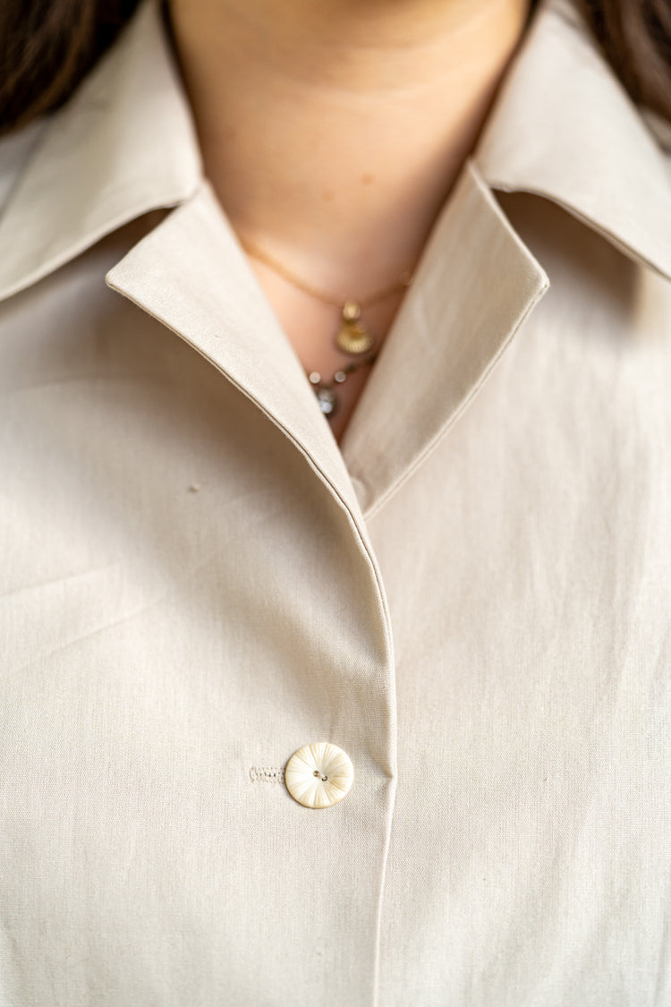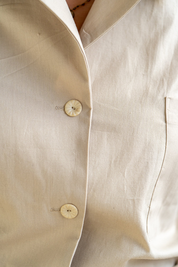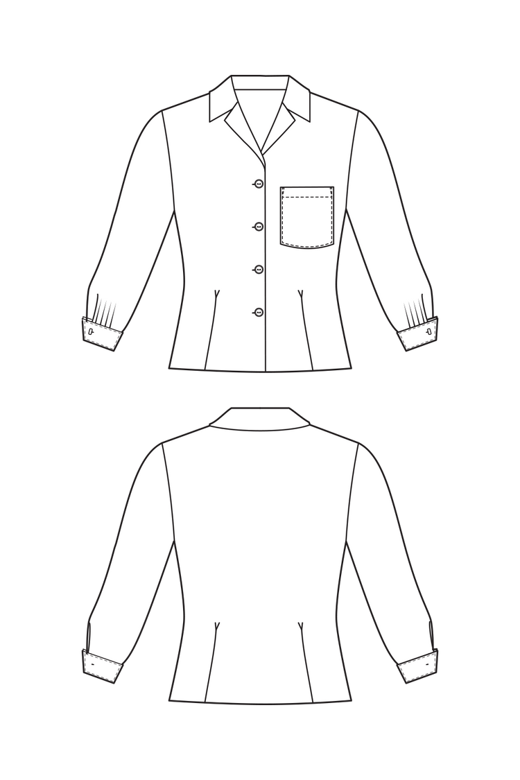 This blouse is a real staple for any closet and can be combined with anything. The blouse is fitted by darts and the shape of the front and back, it has a lapel collar, 7/8-length sleeves and a patch breast pocket.