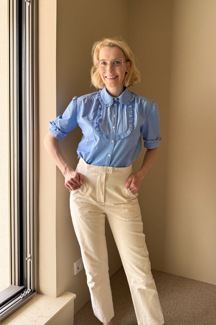 A nostalgic blouse with playful details and a flattering silhouette in the style of Sézane, Cyrillus or other French designer trends: this short-sleeved button-up blouse charms with its rounded collar, pintucked bib front and delicate ruffle trims. Pair it with high-waisted trousers or a skirt for a refined yet relaxed daytime look.