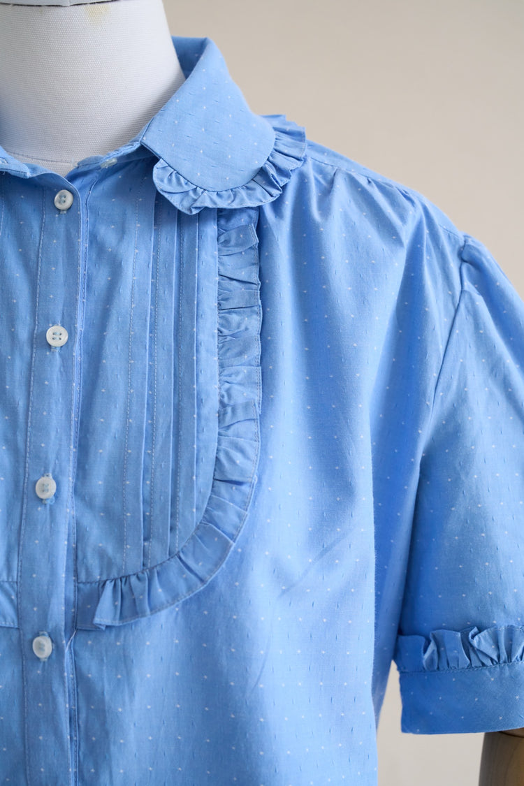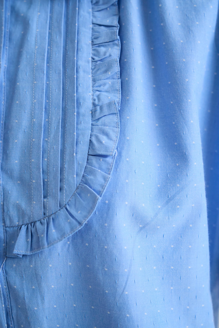 • Bib Front with Pintucks and Ruffles: Eye-catching detail with vertical tucks and a ruffled border, adding dimension and vintage charm