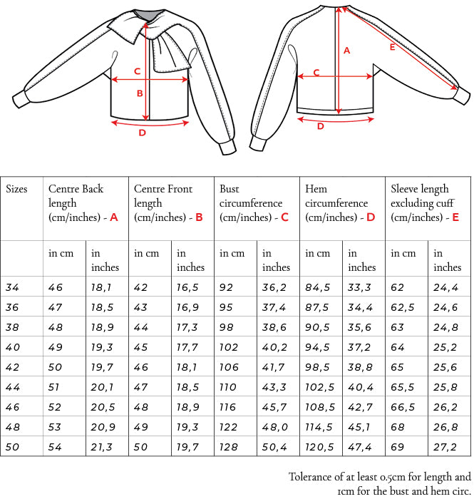 Please find the final measurements of the garment in this table. The measurements can also be found in the instruction booklet.