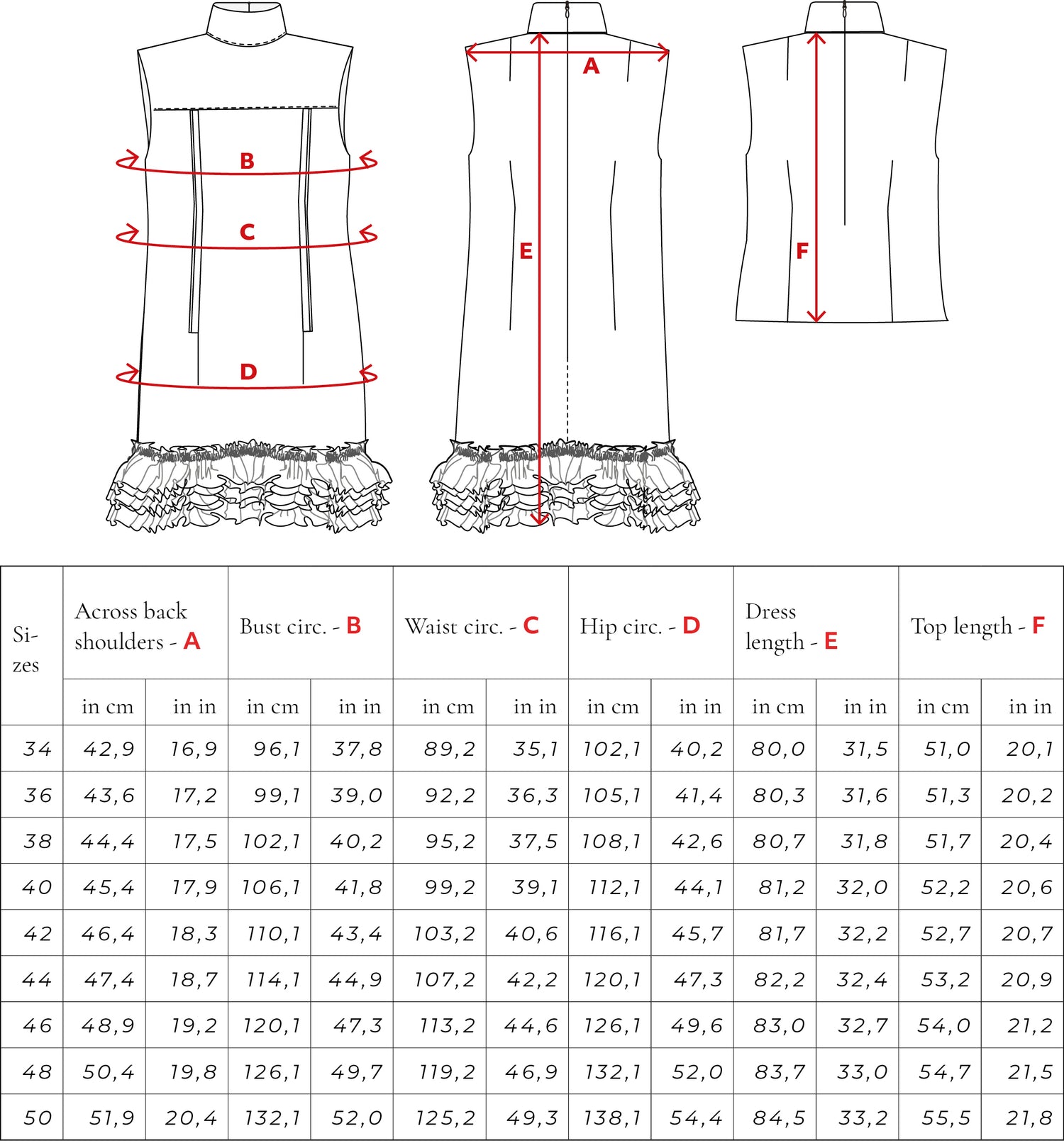 Please find the final measurements of the garment in this table. The measurements can also be found in the instruction booklet.