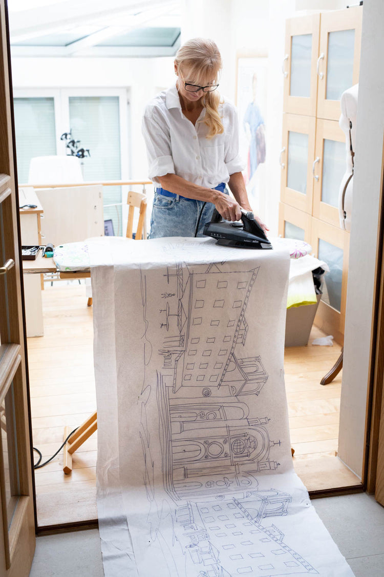 • City illustration & border print: Transfer the city motif with a textile marker and stamp the border using hand-carved potato stamps for a colorful, artistic edge.