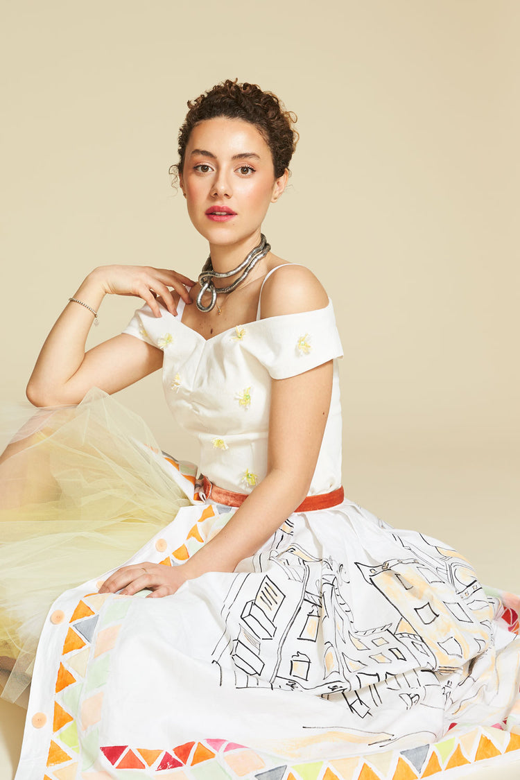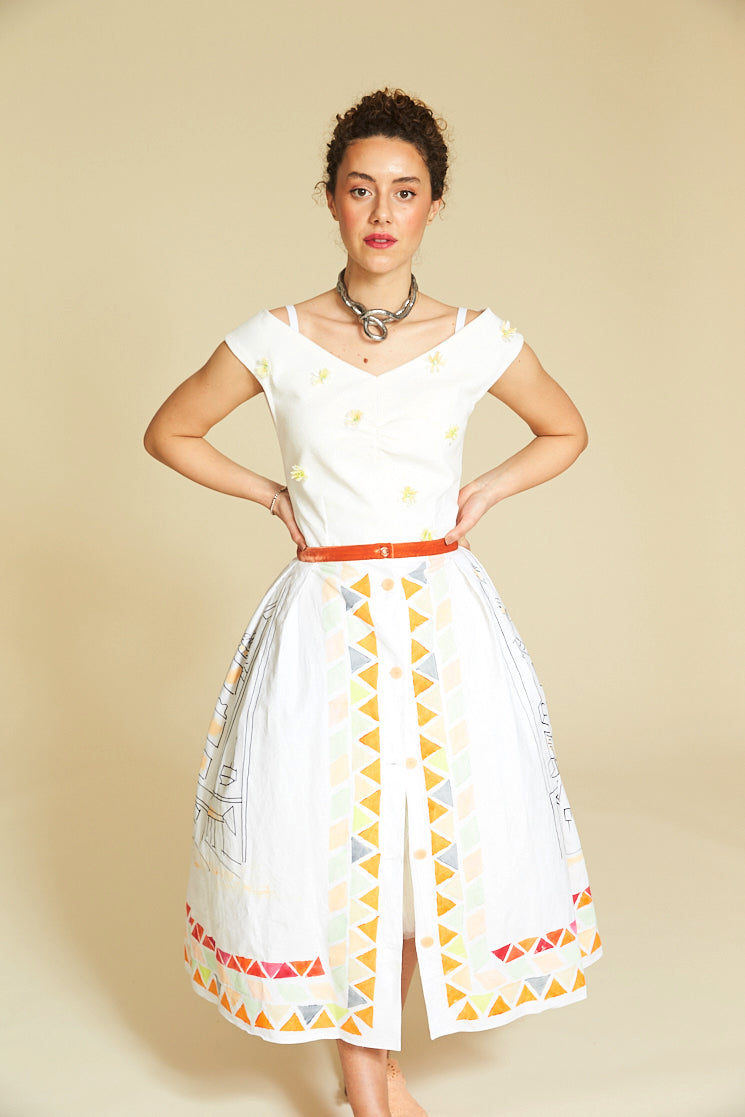 This A-line skirt is not just a sewing project – it’s an art project. With its classic silhouette and clever front pleats, it gains a one-of-a-kind look through a hand-stamped border and illustrated cityscape, created using potatoes, textile paint, and fabric markers. The design allows for personalization, creativity, and a touch of nostalgic flair, while still being elegant and wearable.