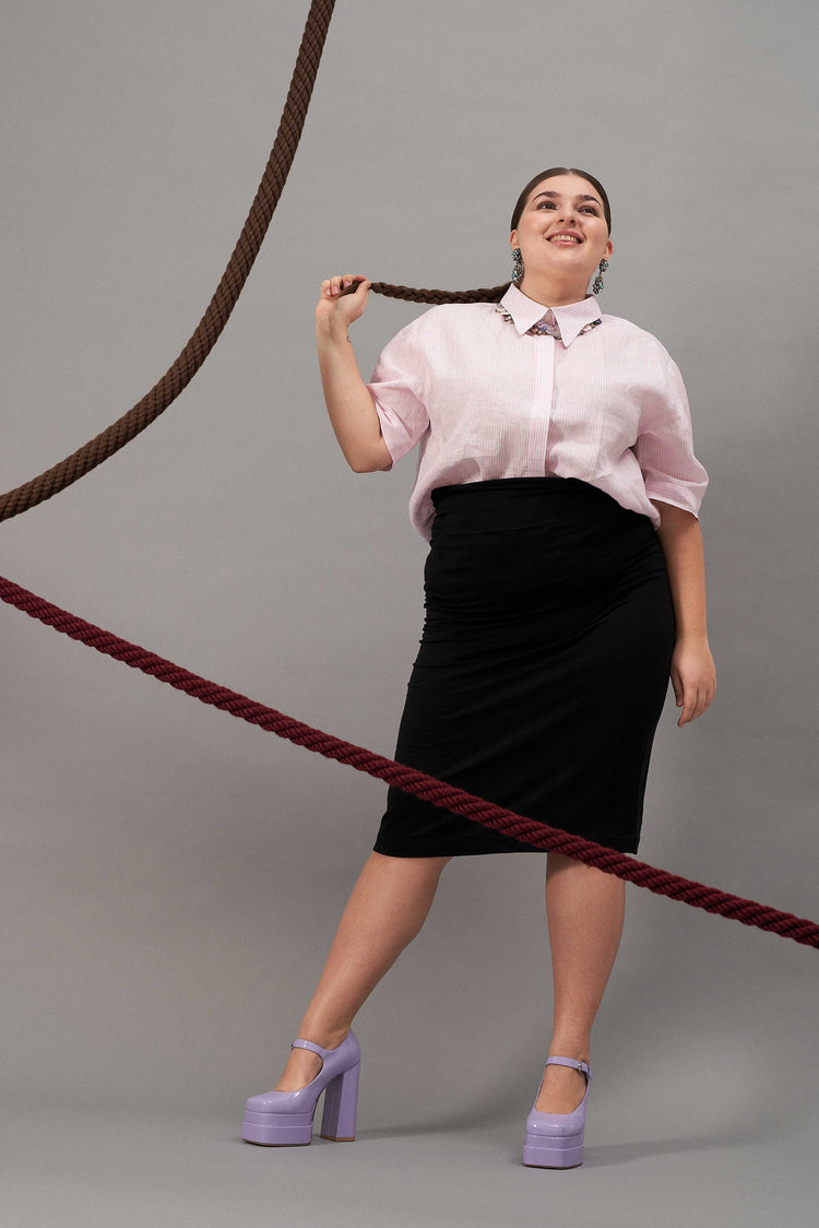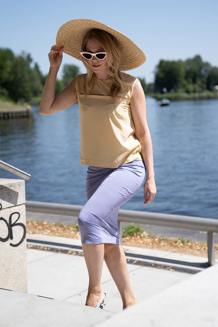 This slim jersey summer skirt from the »Summer in the City« fashion shoot of our sisterMAG No. 50 is simple and flatters the body shapes. With this garment you can create a look for hot days when you still want to look elegant.