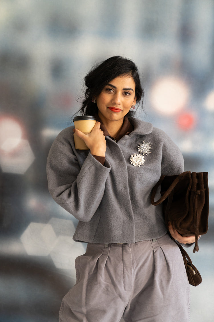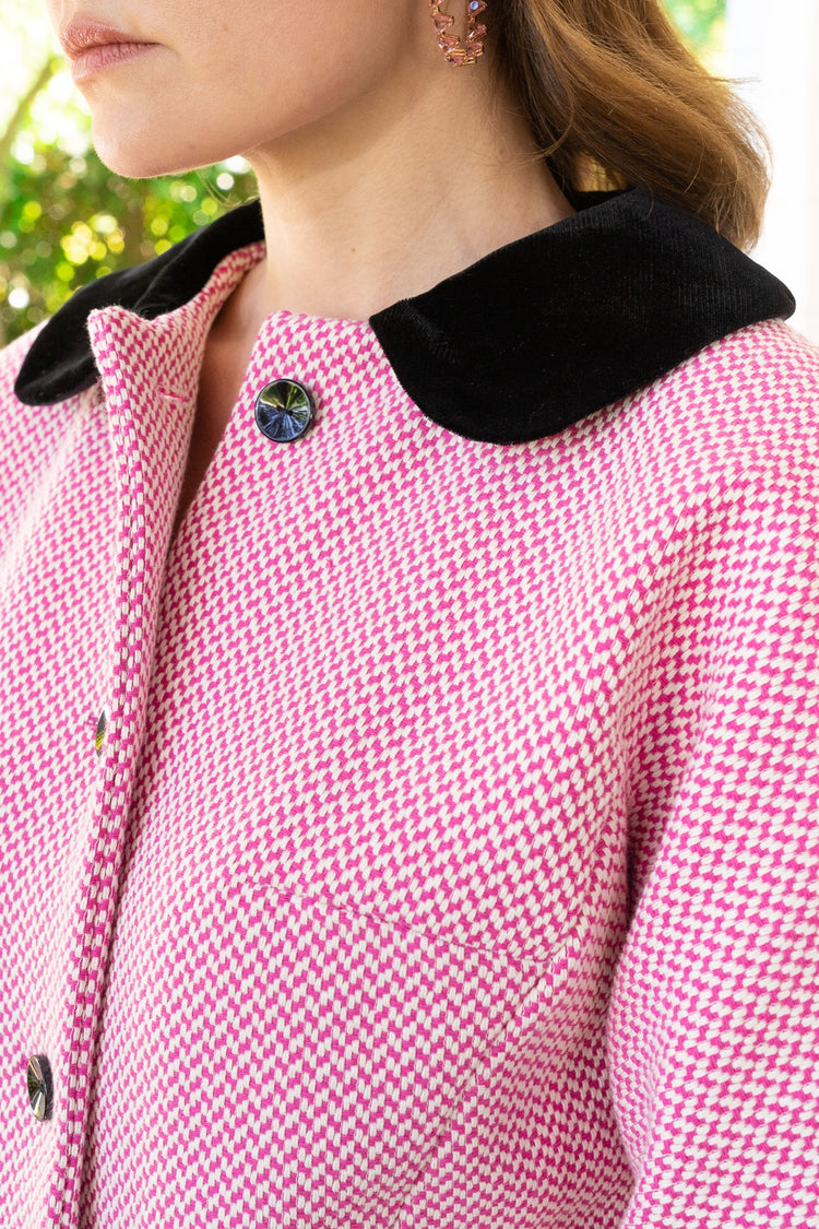• Velvet Collar: A contrasting, luxurious fabric that adds texture and intrigue to the design.