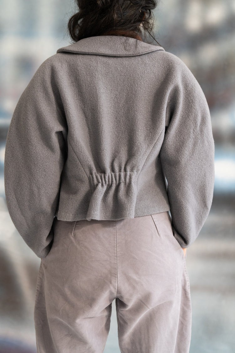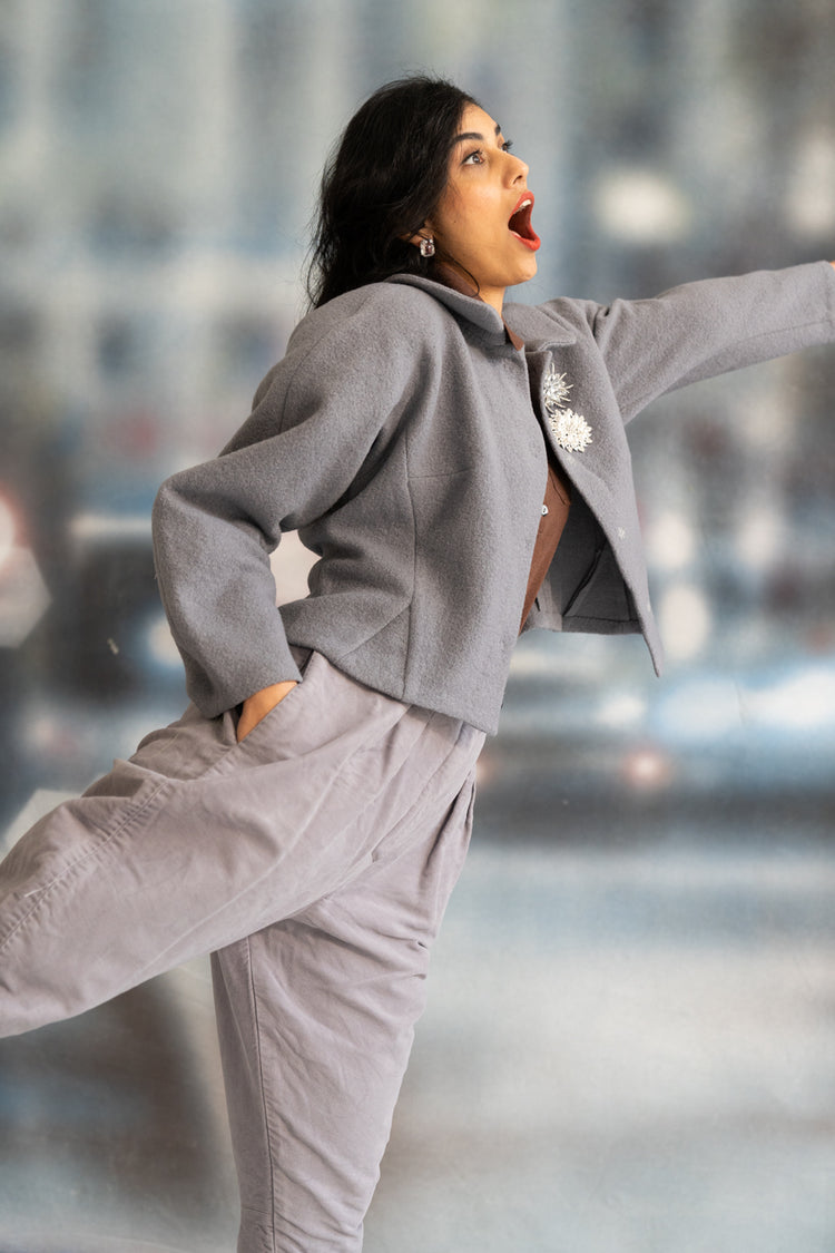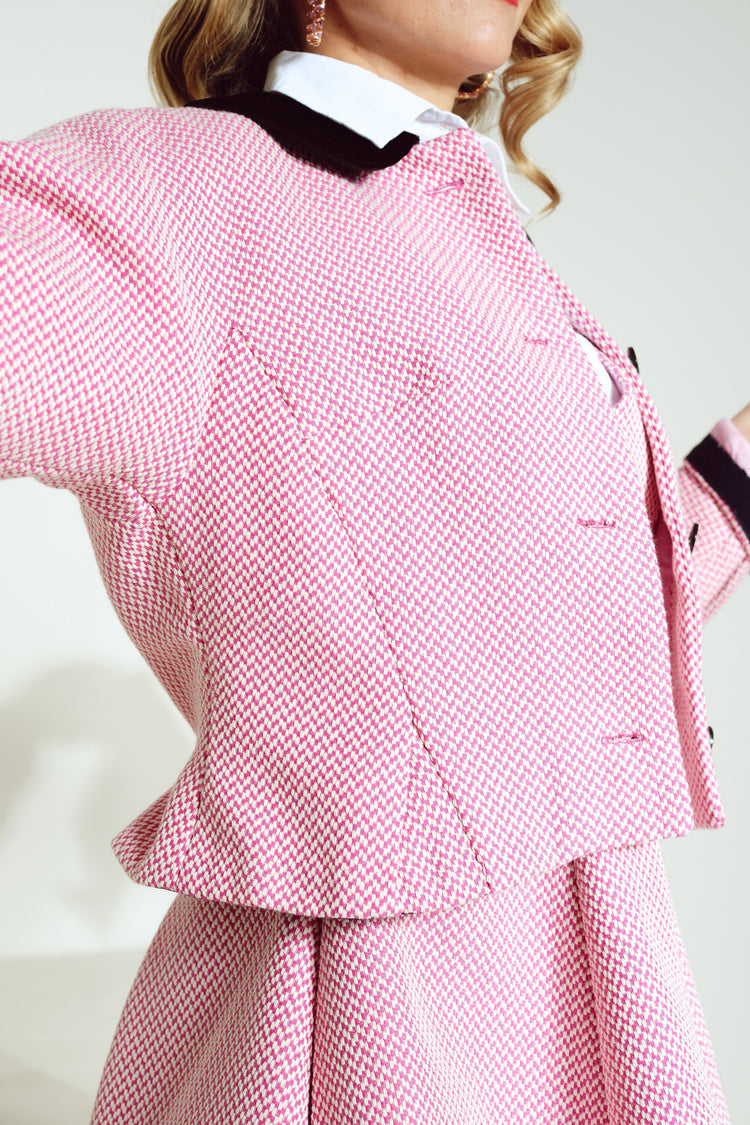 The 67-6 BLISS Jacket combines professional elegance with a fashionable twist. This short jacket features cut sleeves, a peplum silhouette, and a contrasting velvet collar, making it a standout piece. Its unique design incorporates different panels to create a tailored look, while the elastic back adds a round, flattering shape. The cut sleeves enhance the overall round silhouette, and a gusset ensures flexibility, offering freedom of movement. The velvet collar adds an intriguing and luxurious touch, elevating the jacket’s charm and appeal.
