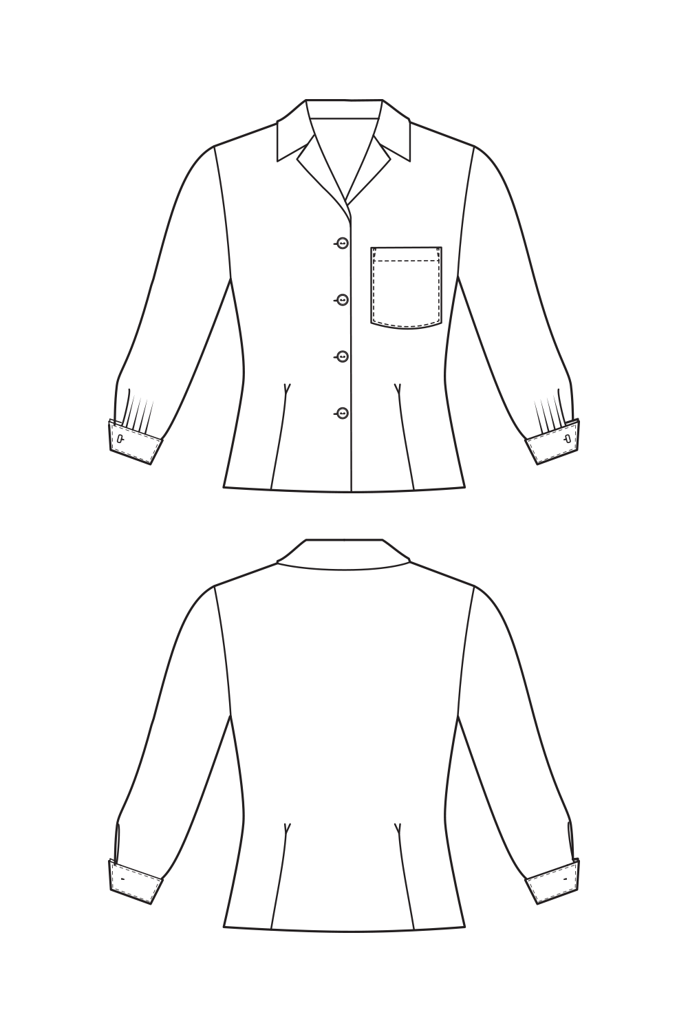 This blouse is a real staple for any closet and can be combined with anything. The blouse is fitted by darts and the shape of the front and back, it has a lapel collar, 7/8-length sleeves and a patch breast pocket.