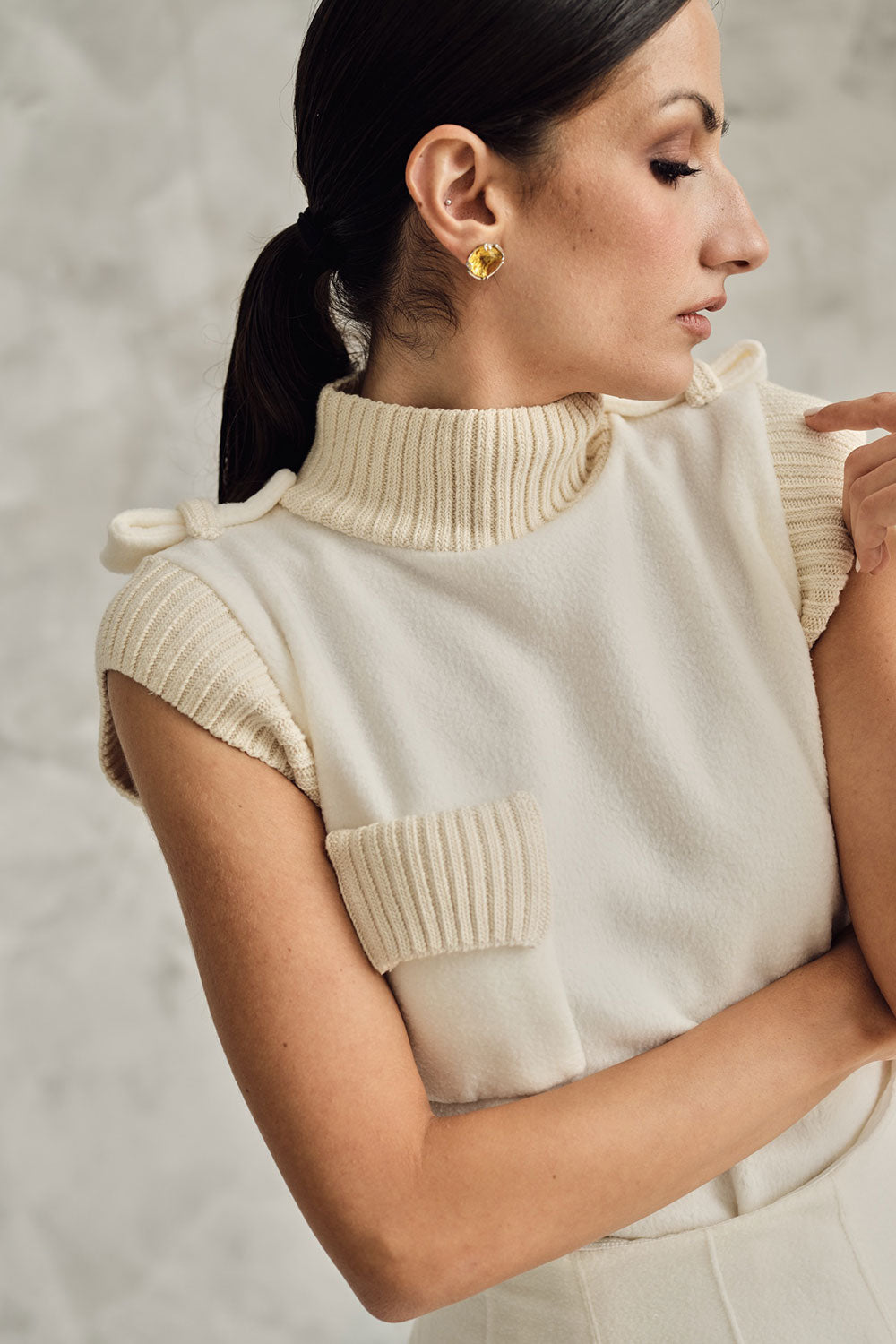 The design features a chic sleeveless shirt, constructed of two types of  jersey knit for ultimate comfort and style. The shirt's chest pocket adds a touch of utility to the overall style, while its fitted silhouette compliments every figure. For an extra stylish twist, we've included striking epaulettes. This shirt is stretchy enough to move with you, ensuring your comfort all day long. What's more, the laid-back design allows for easy dressing up or down, making it a versatile addition to any outfit.