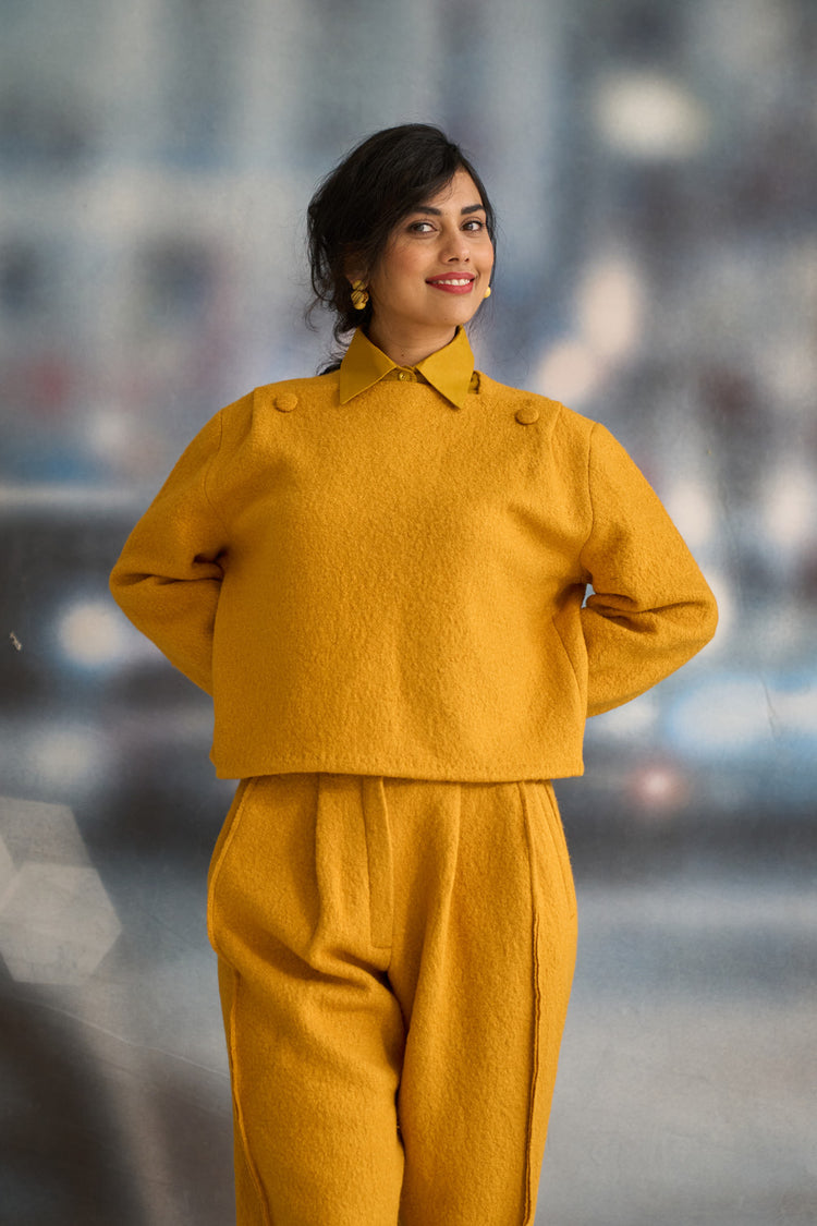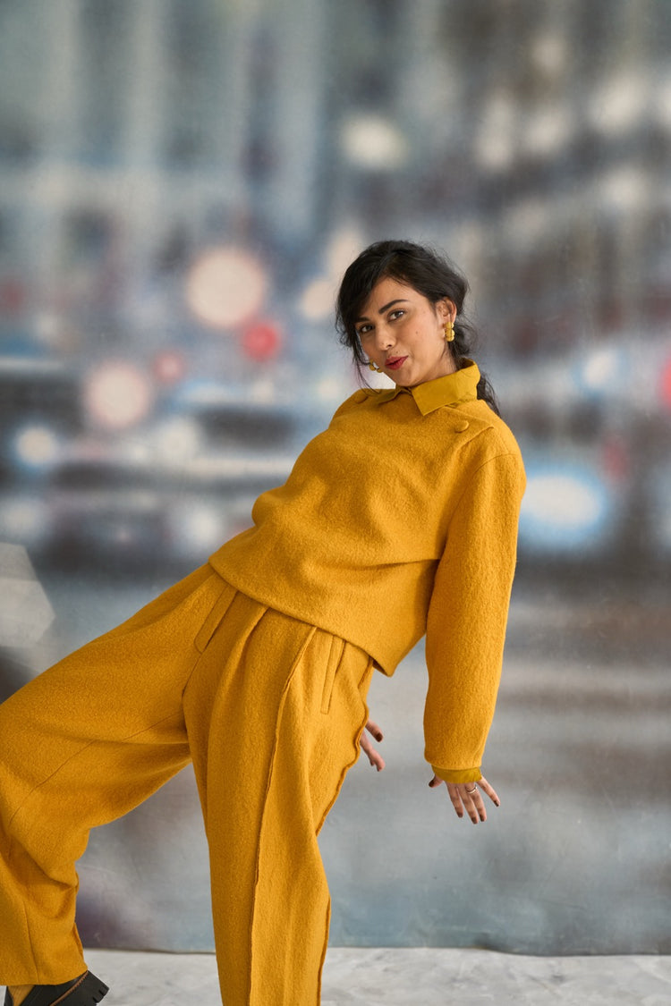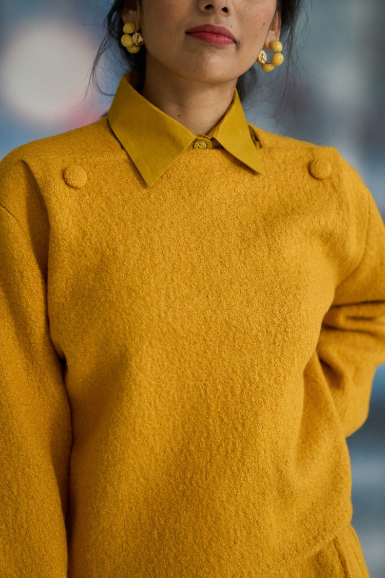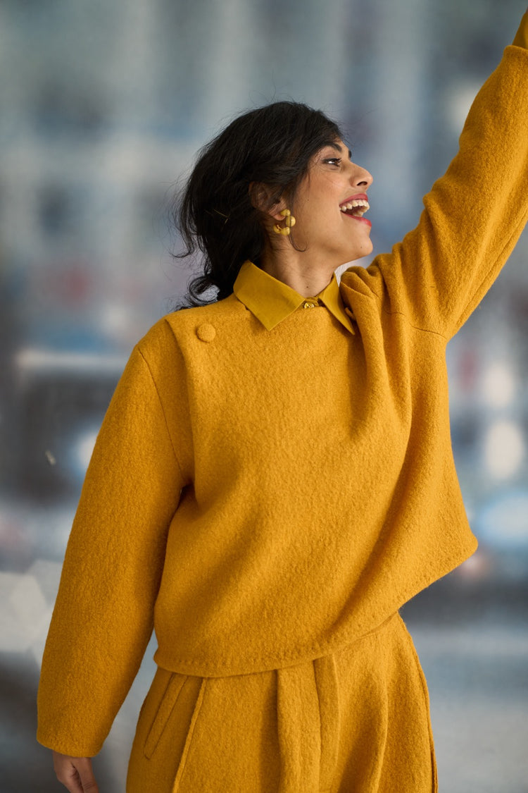 Embrace the cozy and chic style of the 70-16 EMBER Sweater, designed for comfort and elegance. This wool sweater offers a perfect balance between warmth and breathability, making it your go-to piece for cooler days. The slight bubble sleeves add a modern, feminine touch, giving this sweater a contemporary yet timeless appeal. Our favourite detail? The straight neckline with two buttons and two pleats on the shoulders. Perfect for layering or wearing on its own, this piece combines casual charm with a fashionable silhouette.