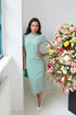 The green and white striped shift dress with kick pleat was created for the fashion feature of sisterMAG 47. With the bars and two buttons on the front it looks particularly interesting and elegant. It is closed on the back with a 60 cm long zip. It is ideal for a business appointment or for afternoon tea in a café.