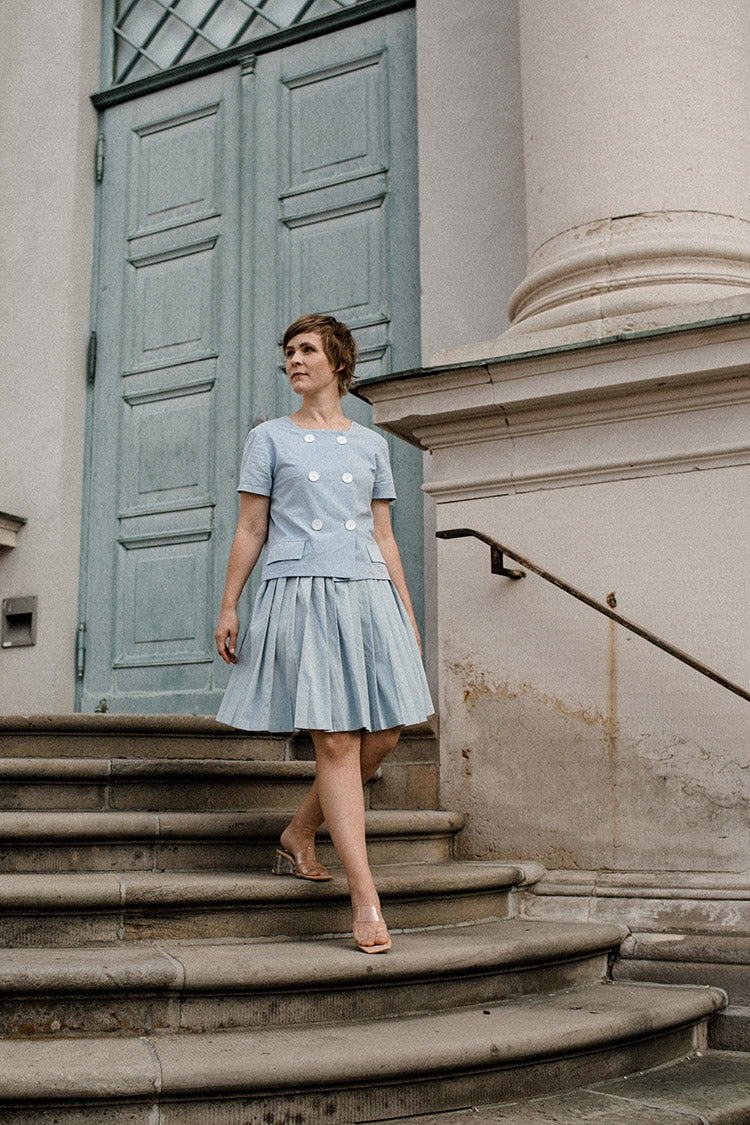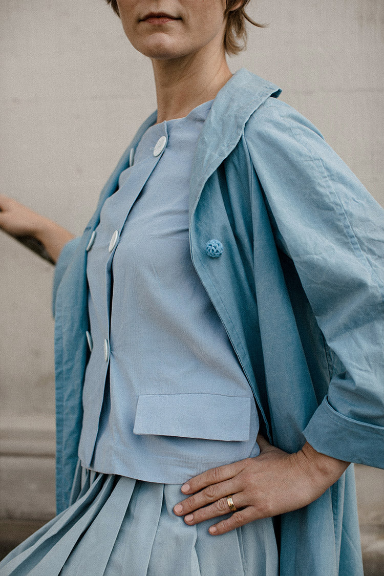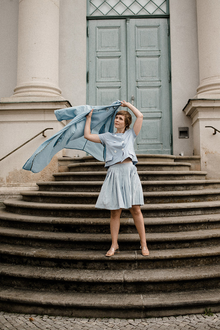 This playful jacket from sisterMAG issue 52 and 63 enchants with its cut. The short sleeves are typical of a shirt, but this jacket is combined with chic buttons and elegant flap pockets. The buttons are two rows and therefore an absolute eye-catcher. The perfect symbiosis of jacket and T-shirt.