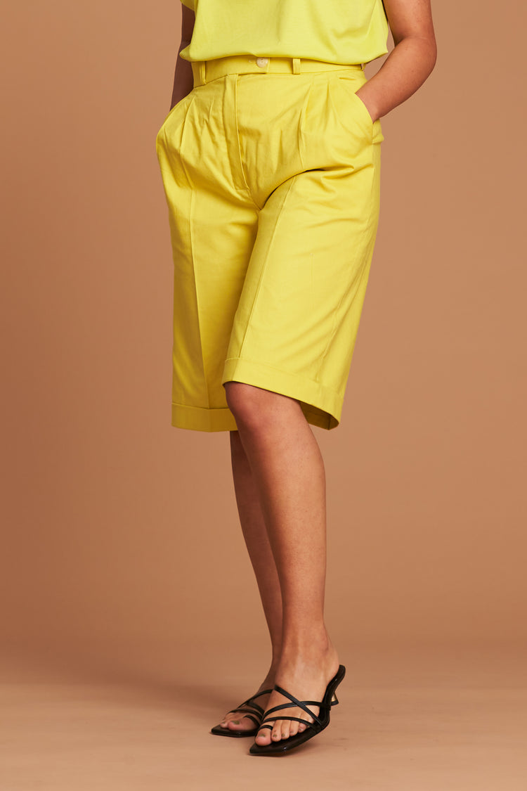 These elegant and comfortable Bermuda pants with crease on the front from the Fashion Shooting of sisterMAG issue 59 are about knee length and are worn high waist. It has two pockets on the sides and is closed with a zipper and button. Sewn-on loops make it possible to wear a belt. Suitable for everyday use as well as for chic occasions.