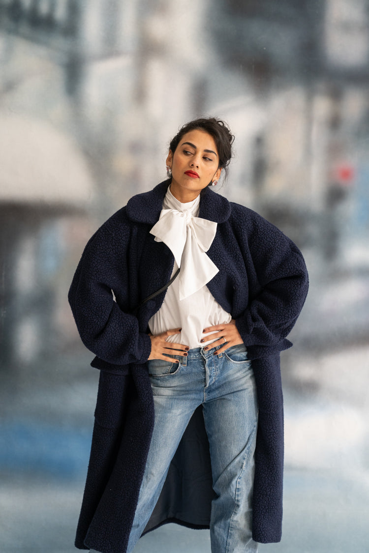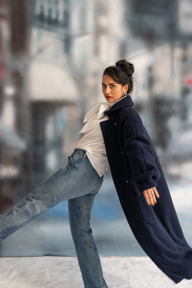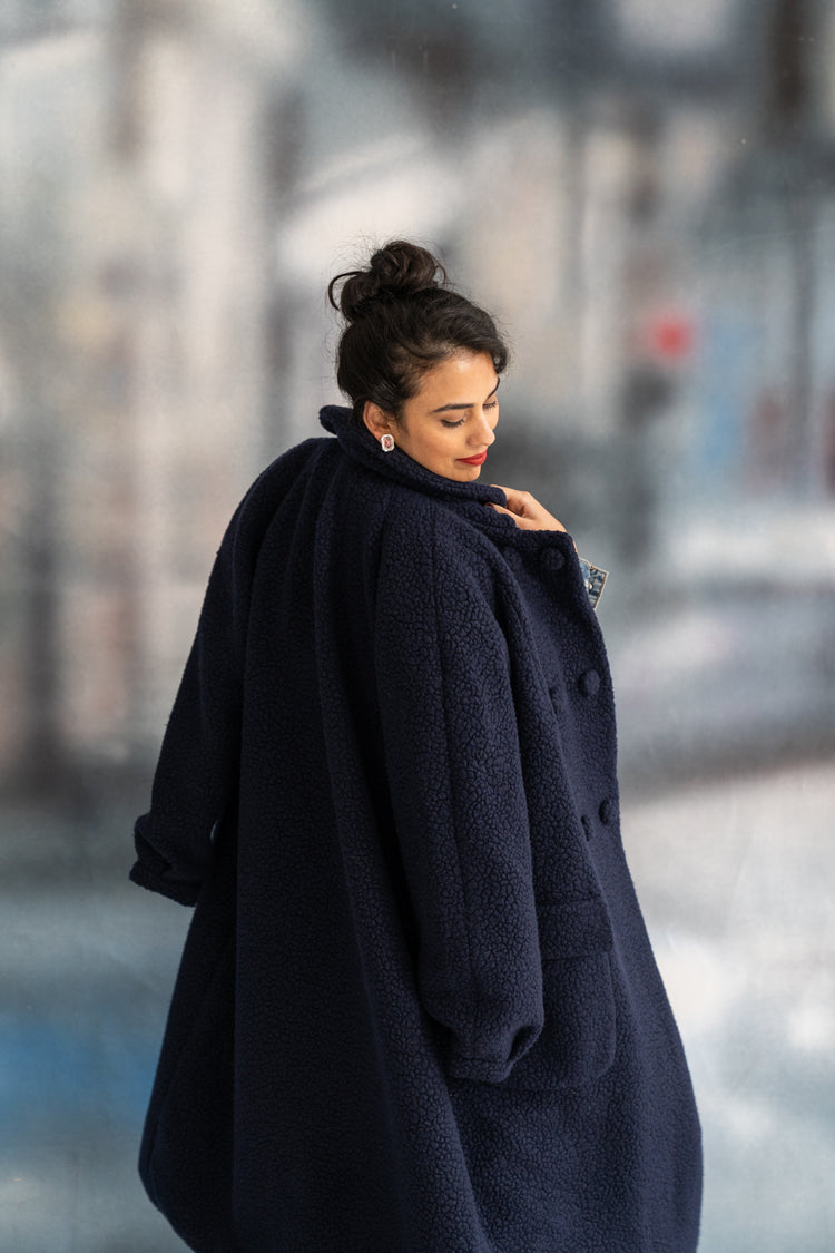 The 71-5 Double-Breasted Coat offers an oversized, fashion-forward look with its wide silhouette, balloon sleeves, and round collar. This fully lined coat is perfect for those looking for a standout piece with a modern touch. It features covered buttons and large, patch pockets for a polished and stylish appearance.