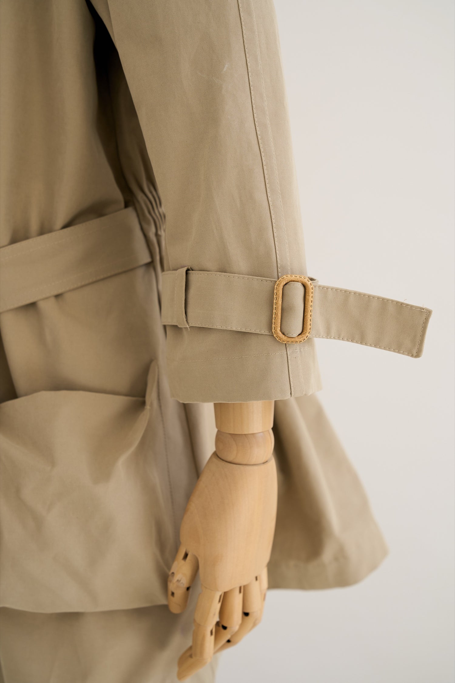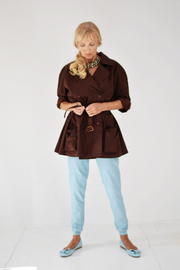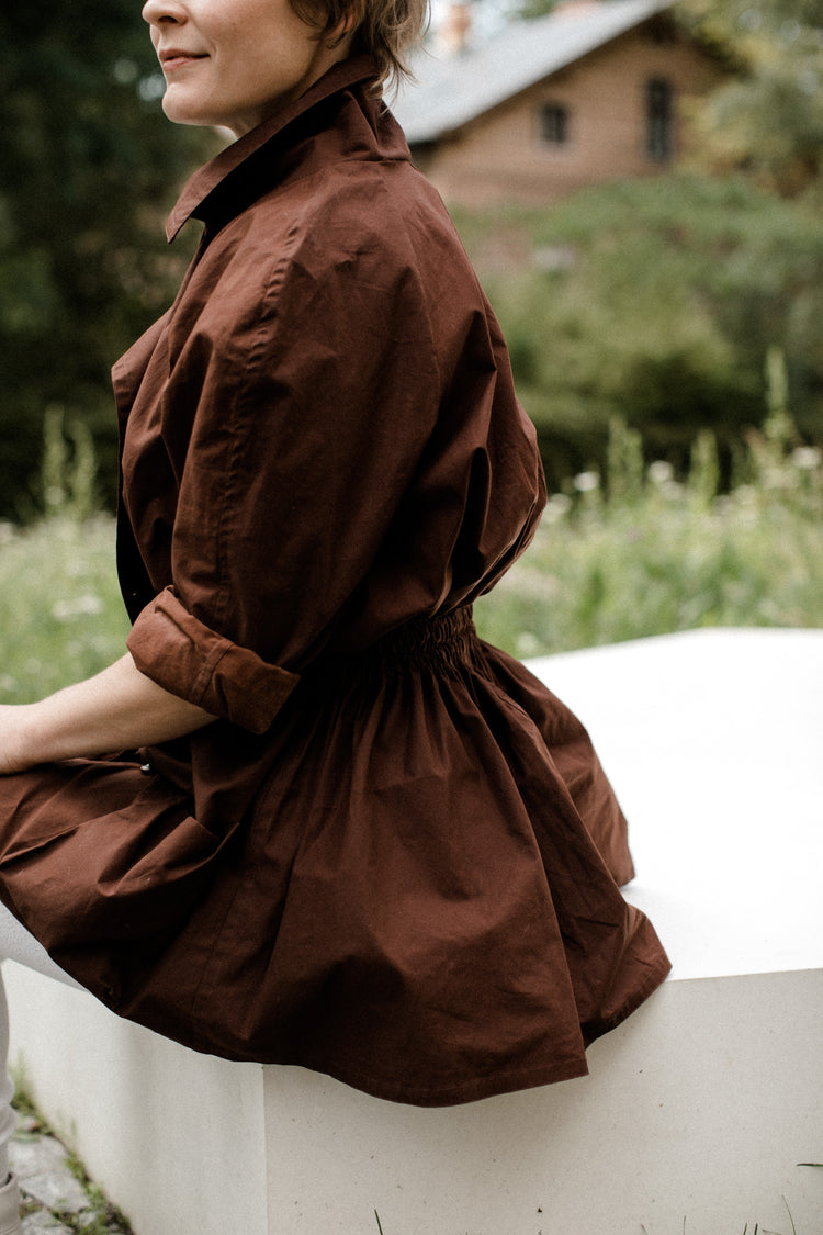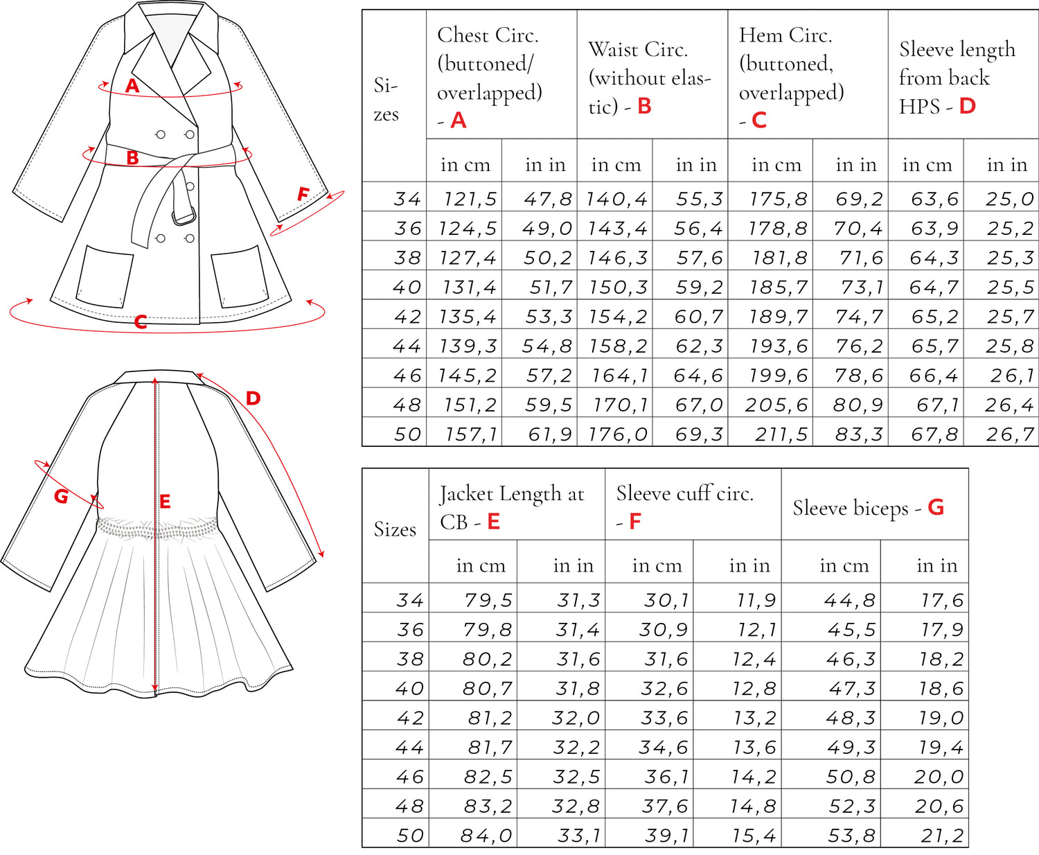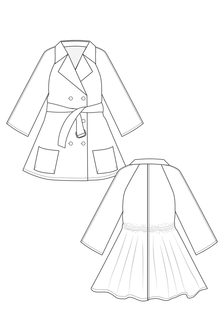 Our 57-2 MARLOW sewing pattern features a short and wide trench-style coat that blends utility with refined design. Whether sewn from a coated cotton or other jacket-weight fabric, this unlined coat is ideal for layering during transitional seasons. The wide shape and adjustable elastic in the back ensure both comfort and contemporary flair. The standout detail: oversized bellows pockets and a striking belt with buckle.