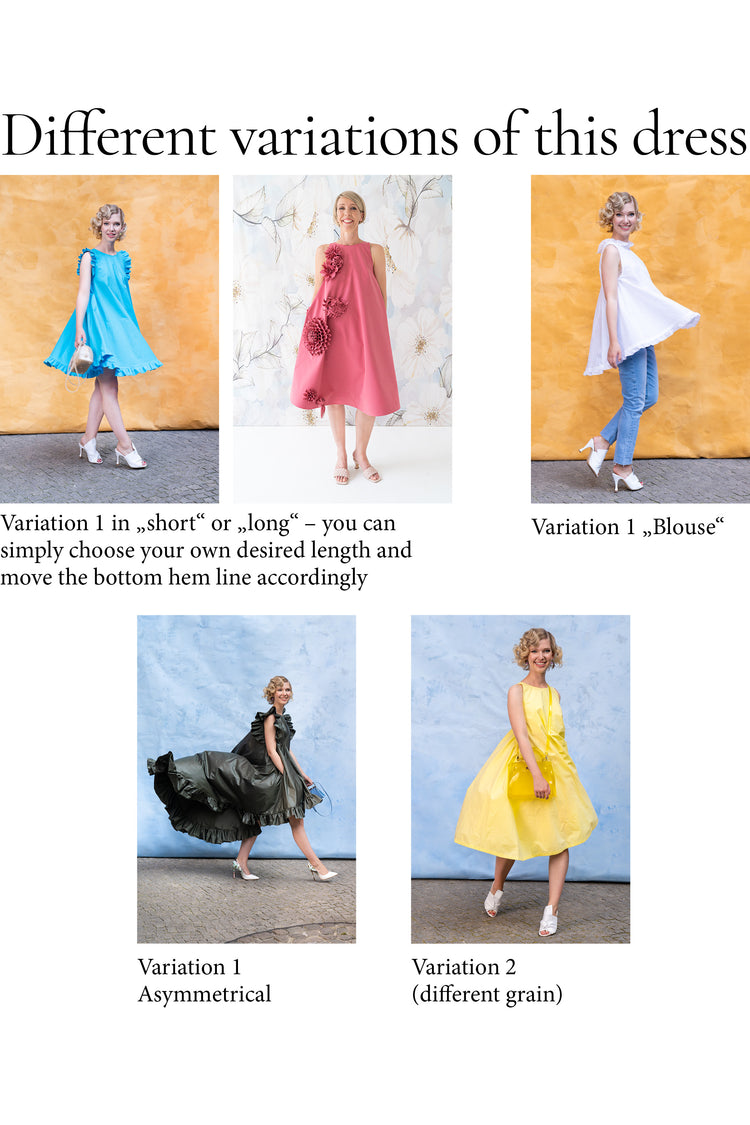 An easy summer dress that can be made of almost any kind of fabric. Whether sturdy linen or soft and flowy cotton, it always turns out different but beautiful. A true all-rounder to get creative with. Our instruction refers to the most basic cut, but there are lots of ways to modify the dress. Our pattern gives you different variations: