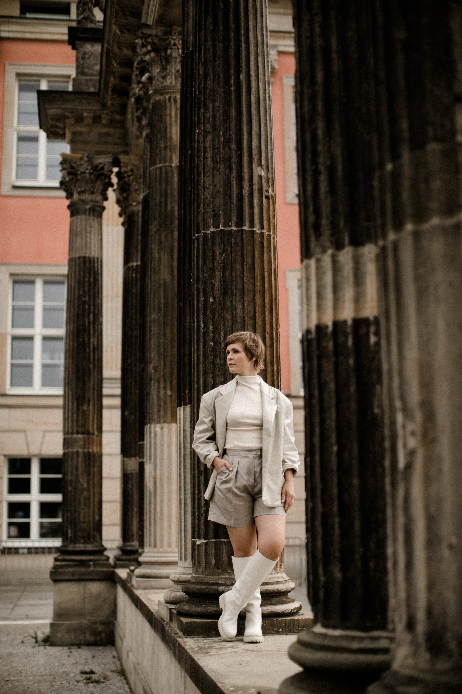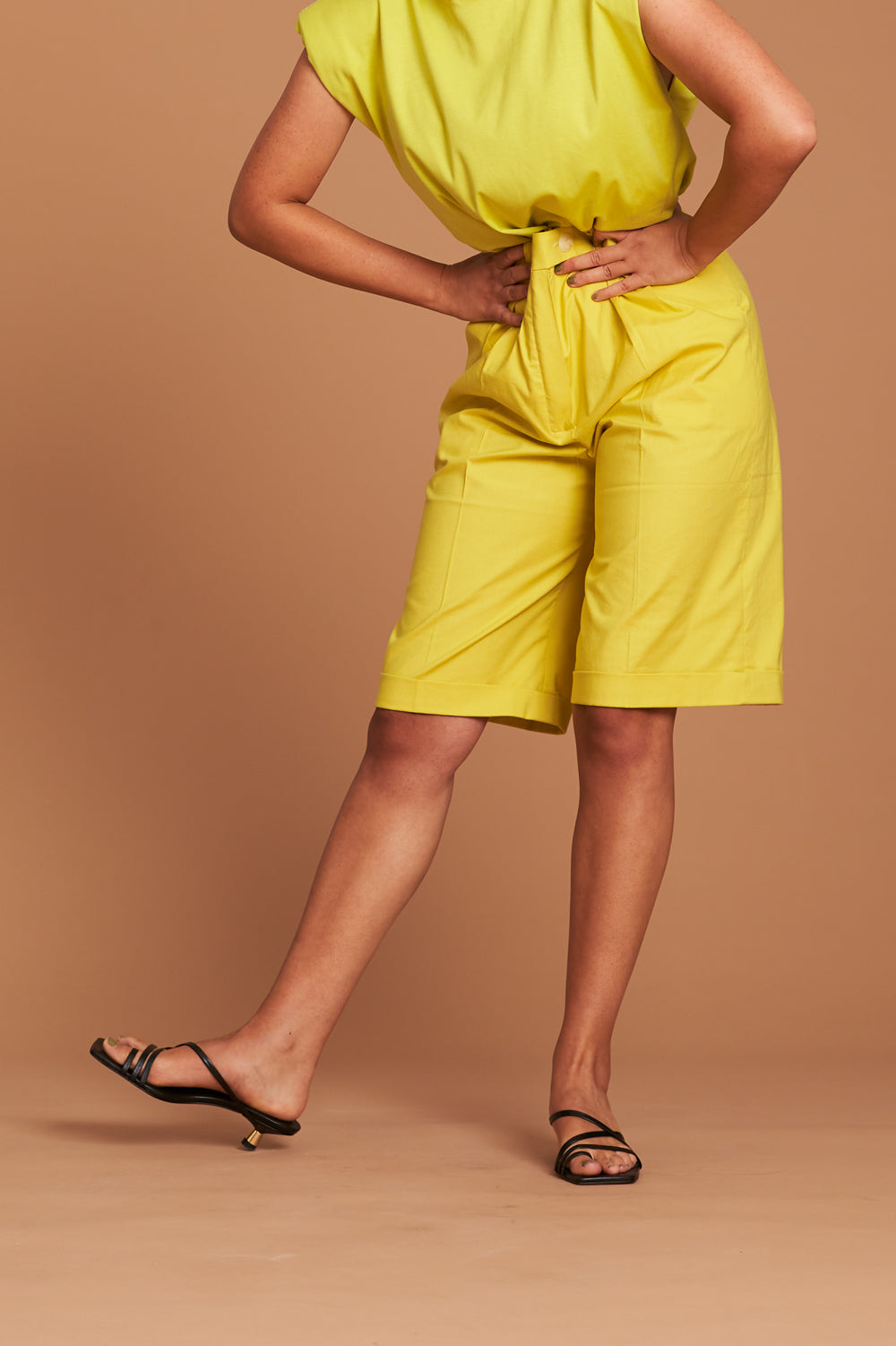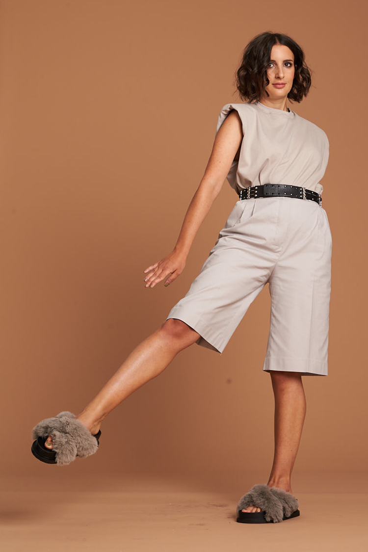 These elegant and comfortable Bermuda pants with crease on the front from the Fashion Shooting of sisterMAG issue 59 are about knee length and are worn high waist. It has two pockets on the sides and is closed with a zipper and button. Sewn-on loops make it possible to wear a belt. Suitable for everyday use as well as for chic occasions.