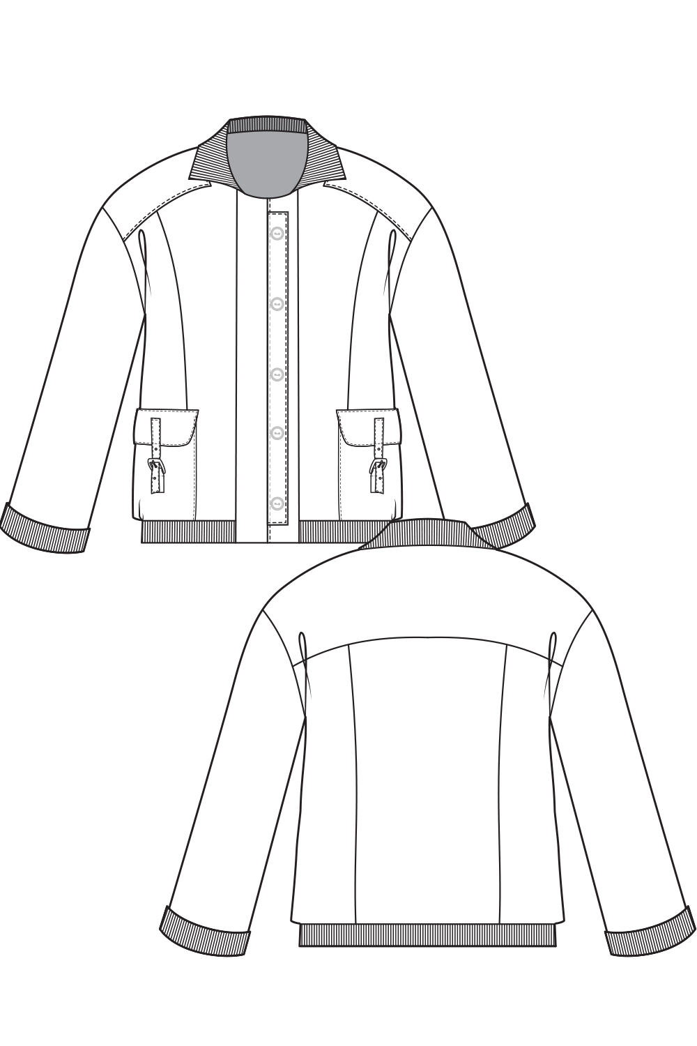 The jacket features rib cuff finishings on the collar, cuffs and waistband. The sleeves are made of two pieces and two large pockets with flaps are sewn on the front of the pattern. The pattern comes fully lined with separate lining pieces being part of the sewing pattern.