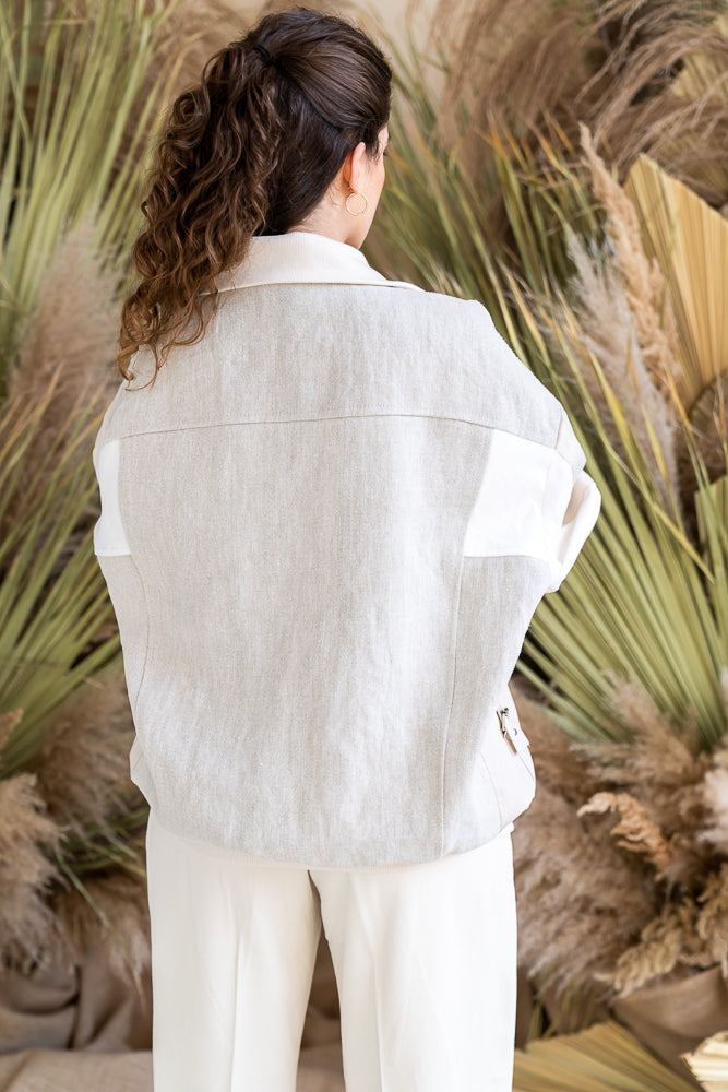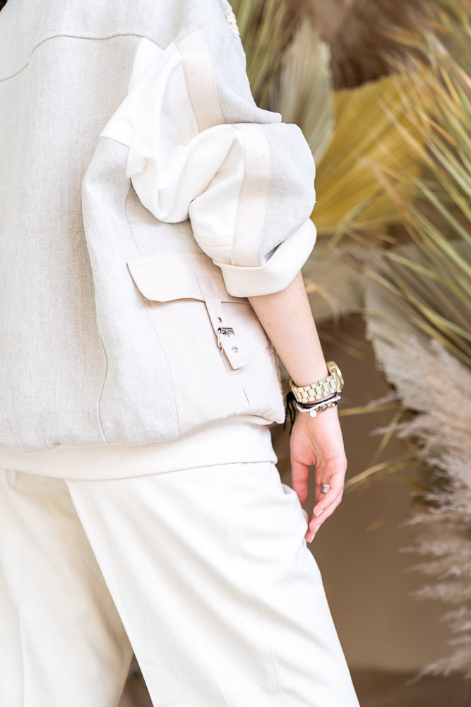 An absolute dream project for advanced sewists: our oversized patchwork blouson is a statement piece at its core, even if done in such a subtle manner of creams and whites. The oversized boxy cut is can be done with large crochet panels in the front. We have included three example crochet patterns in the instruction booklet, but feel free to experiment and try out whatever patterns you like.